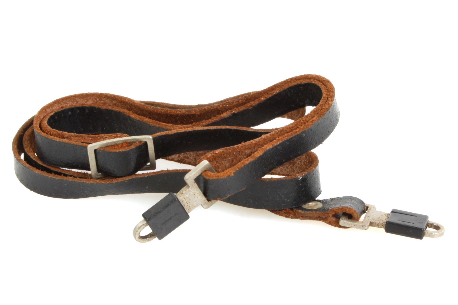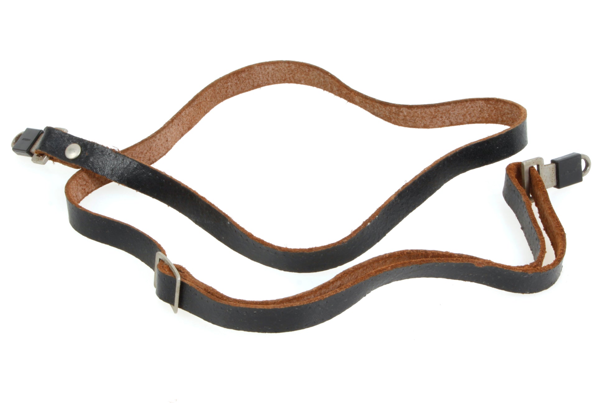 Vintage black leather camera strap with safety clips. Strap measures approximately 3/8 inch wide and 36 inches long. In good vintage condition with light signs of use and some rust spots to the metal parts.
