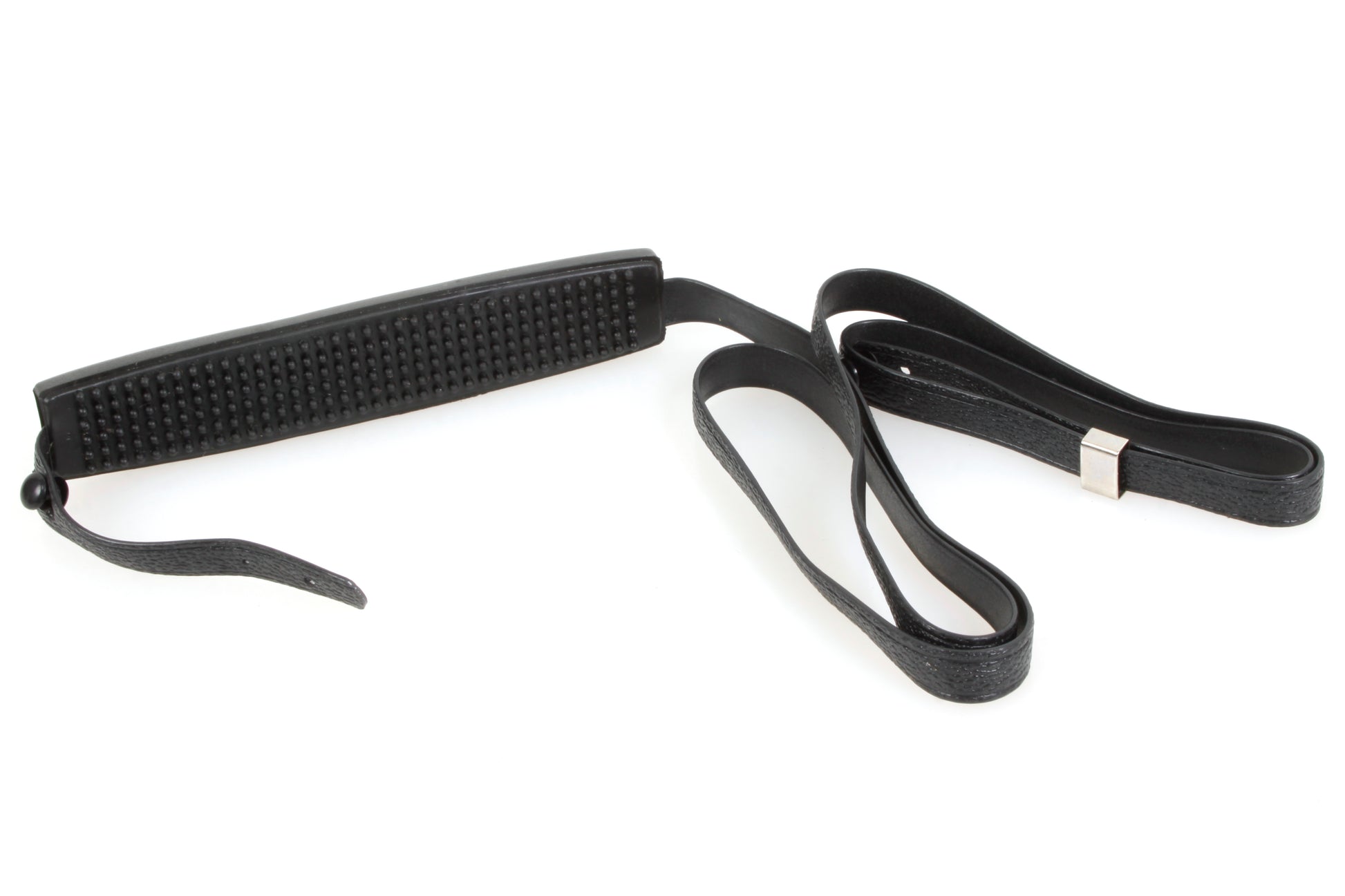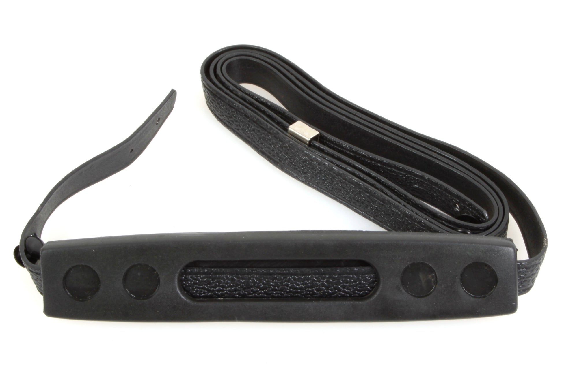 Vintage black vinyl camera strap with rubber pad. Strap measures approximately 3/8 inch wide and 42 inches long. New old stock.