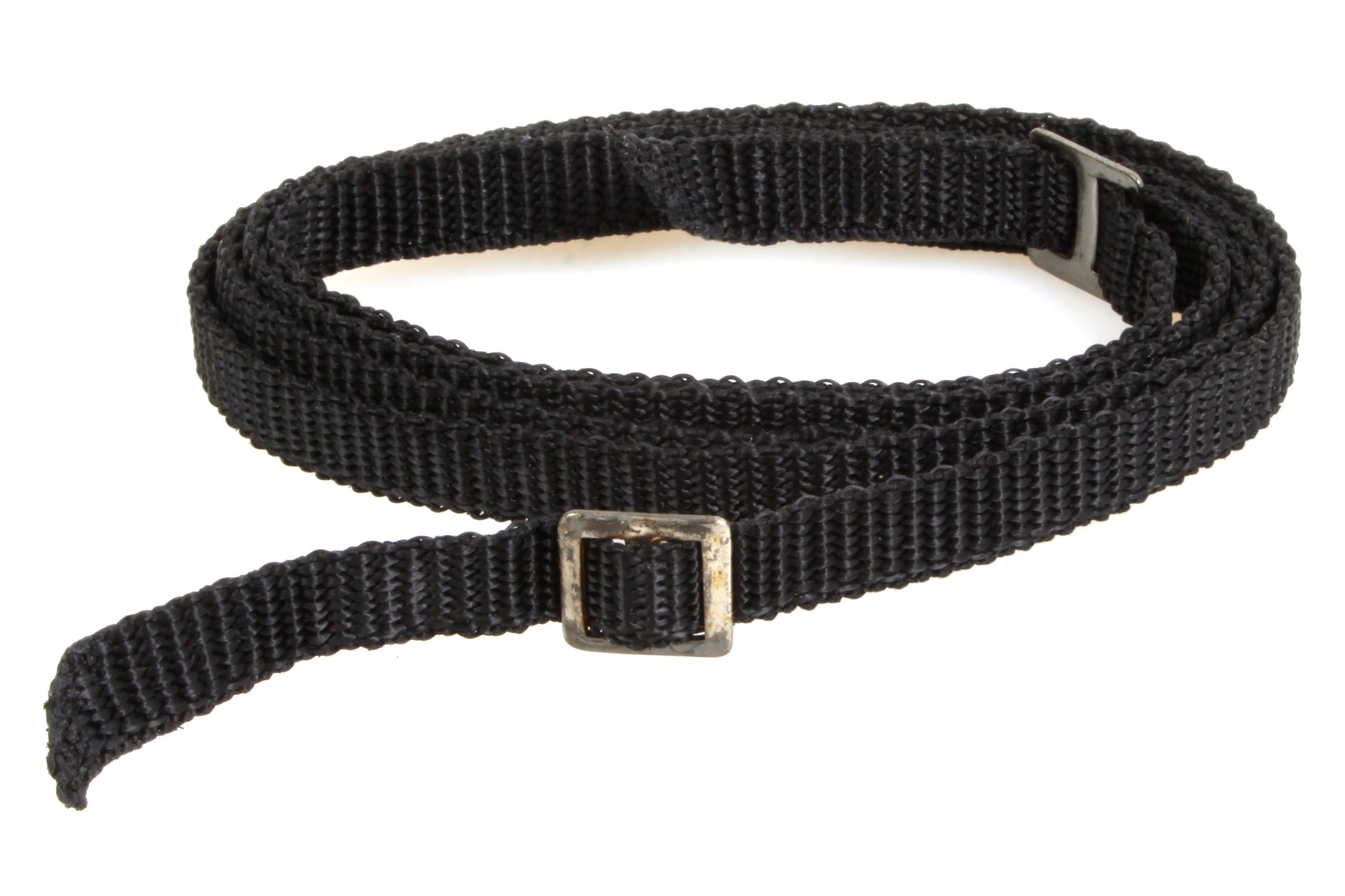 Vintage black camera strap. Strap measures approximately 3/8 inch wide and 45 inches long. In good vintage condition with some signs of use and some rust to the metal parts.