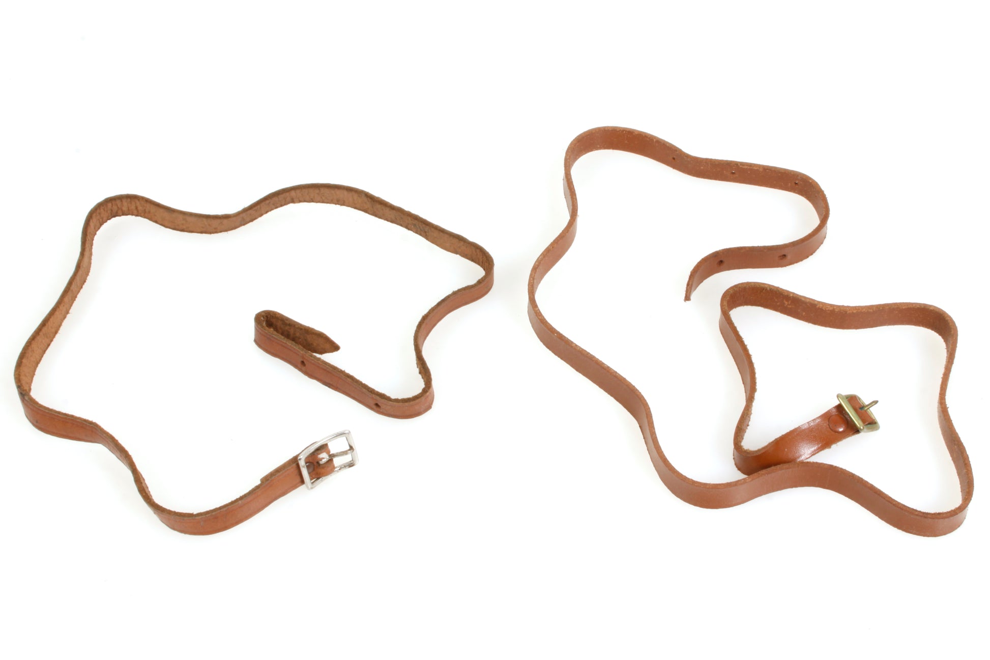 Lot of two brown leather camera straps. One measures approximately 7/16 inch wide and 27 inches long, and the other 1/2 inch wide and 35 inches long. In good vintage condition with some wear, cracking, general signs of use and some rust/tarnishing to the metal parts.