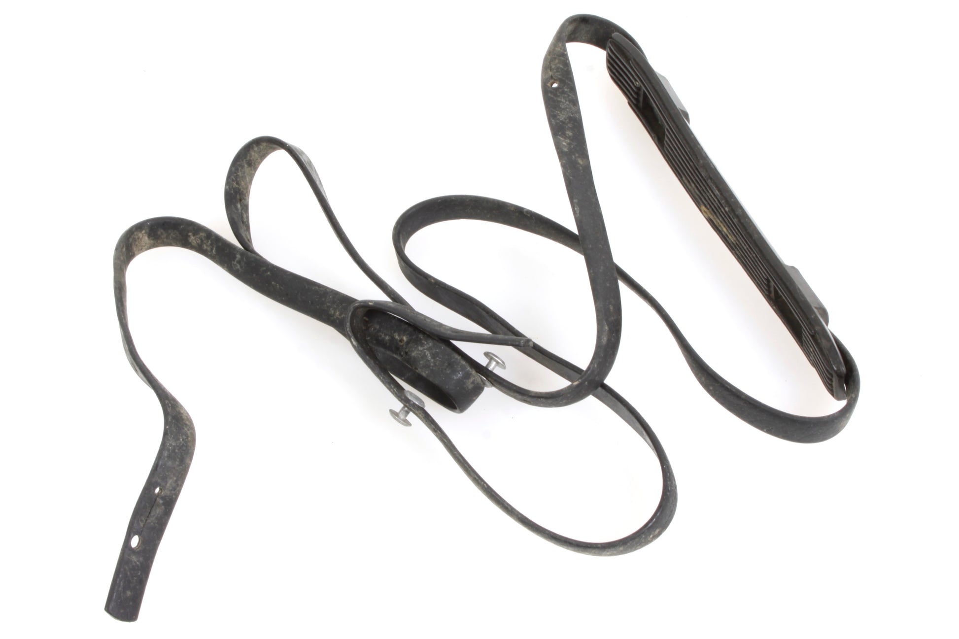 Vintage Canon black vinyl camera strap with rubber pad. Strap measures approximately 3/8 inch wide and 45 inches long. In good vintage condition with some marks and general signs of use.