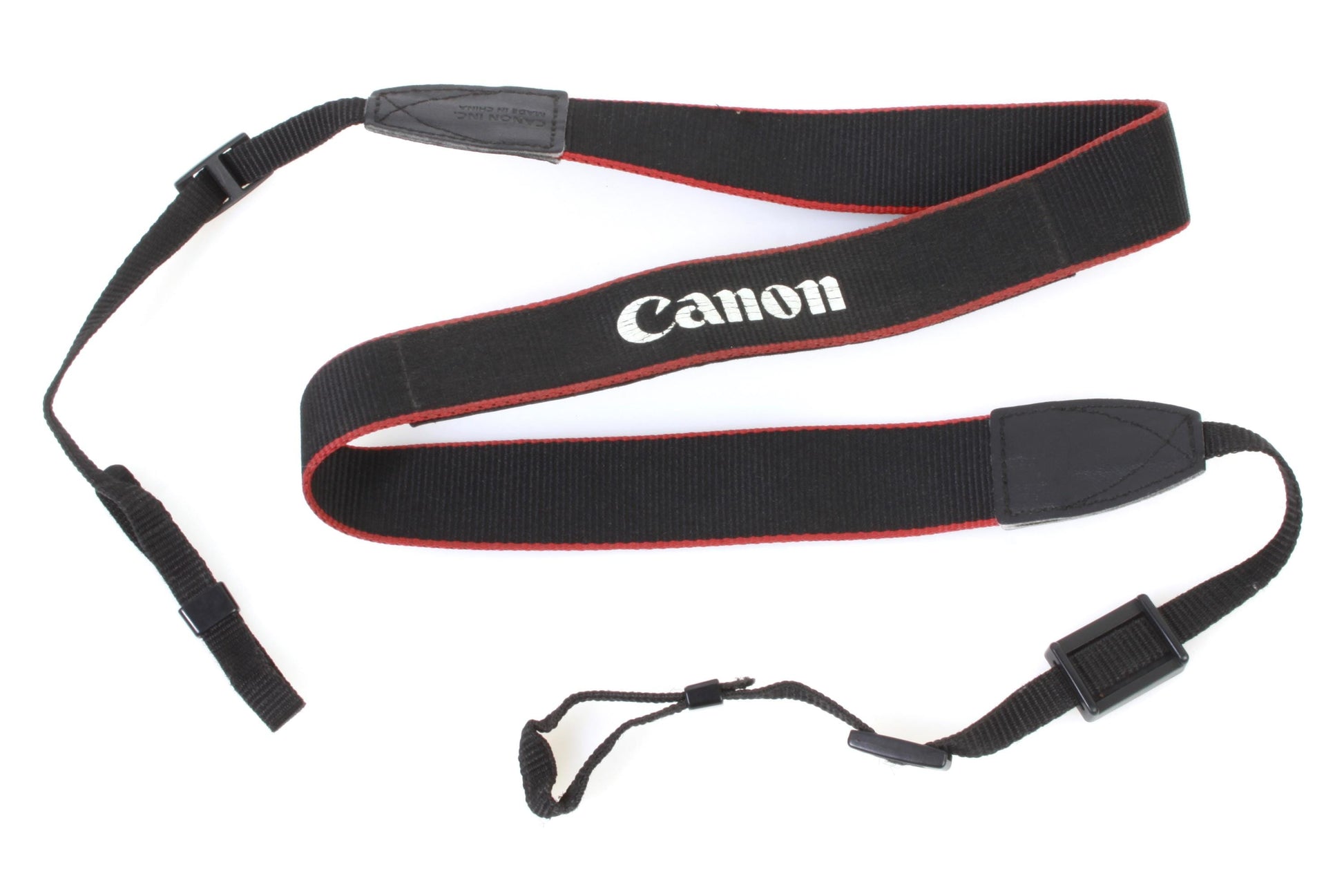 Canon black and red strap with white printed logo. Measures approximately 3/8 inch wide at the narrow part, 1 1/8 inches at the wide part and 49 inches long. In good vintage with some general signs of use and some cracking to the logos.