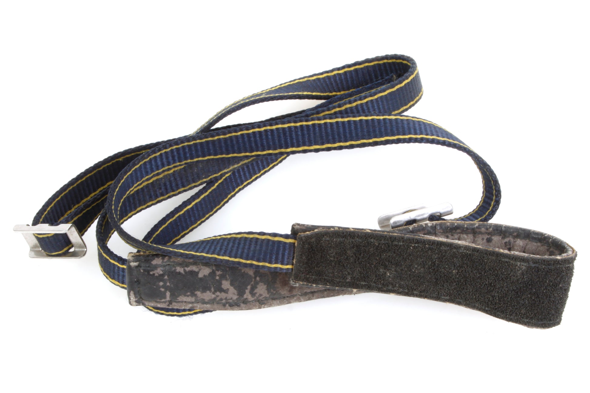 Canon black, blue and yellow camera strap. Strap measures approximately 7/16 inch wide at the narrow part, 15/16 inch at the wide part and 47 inches long. There is significant cracking and disintegration to the leather-look part. Sold as is.