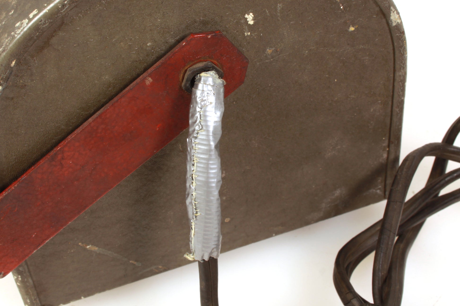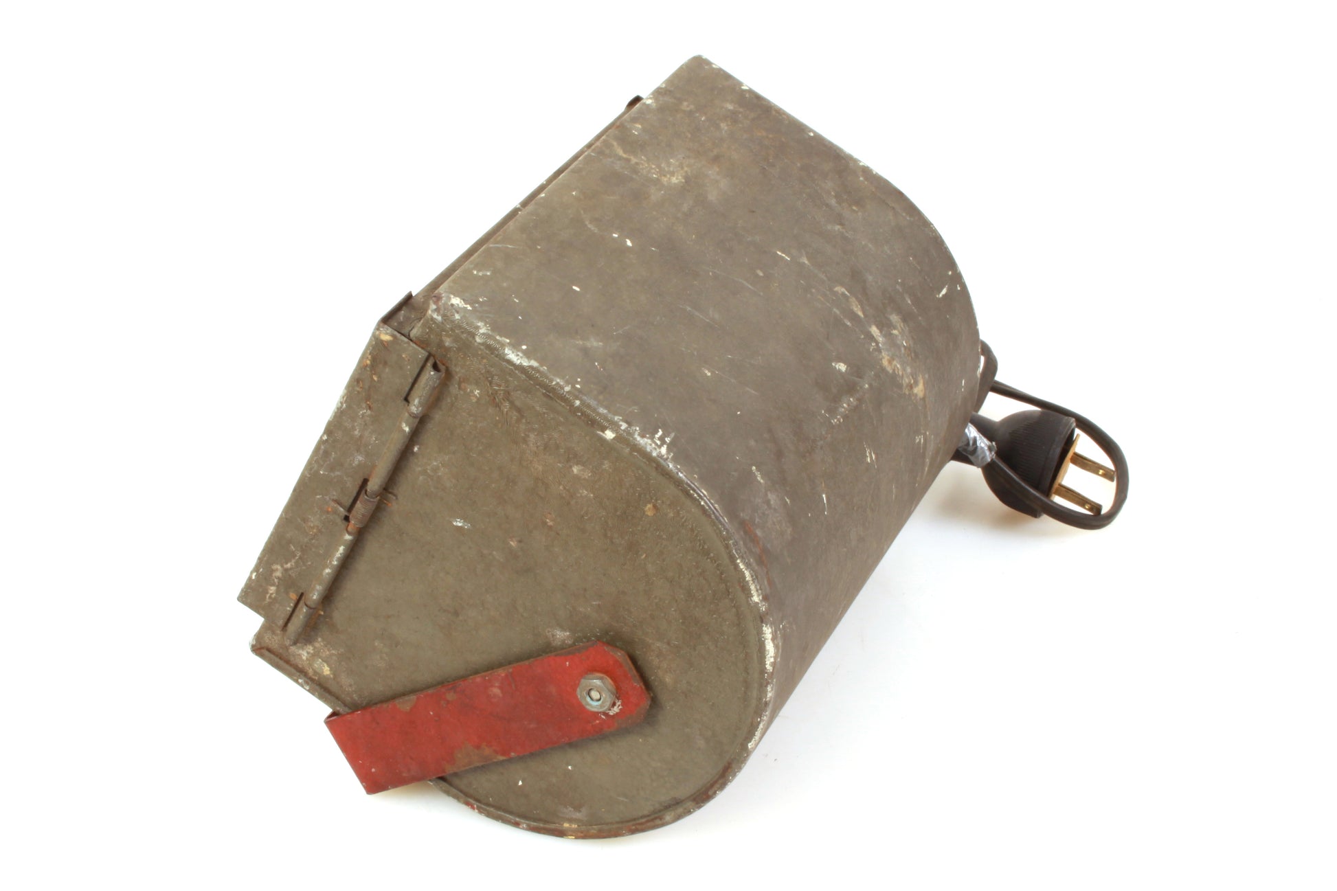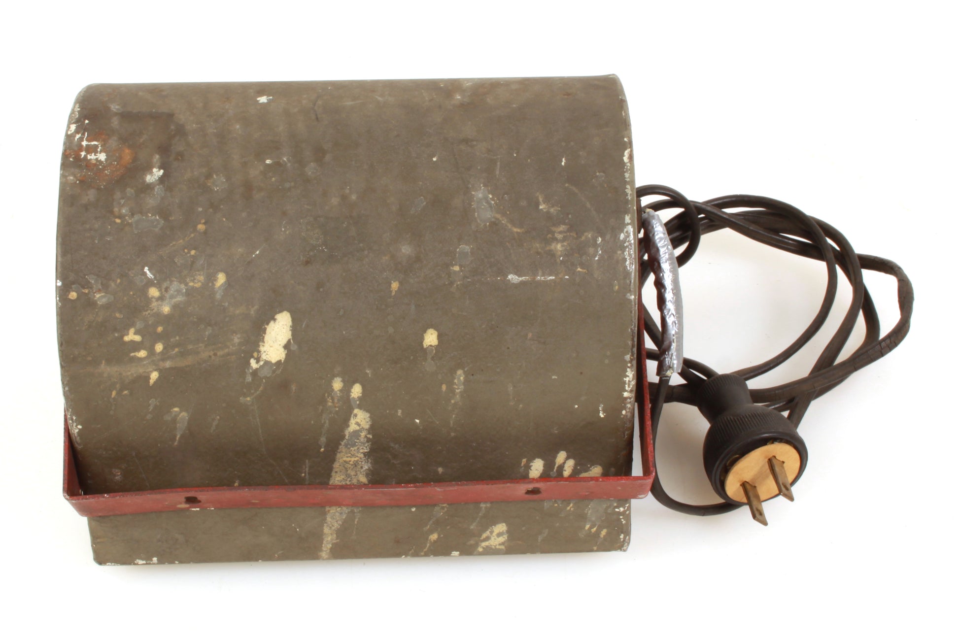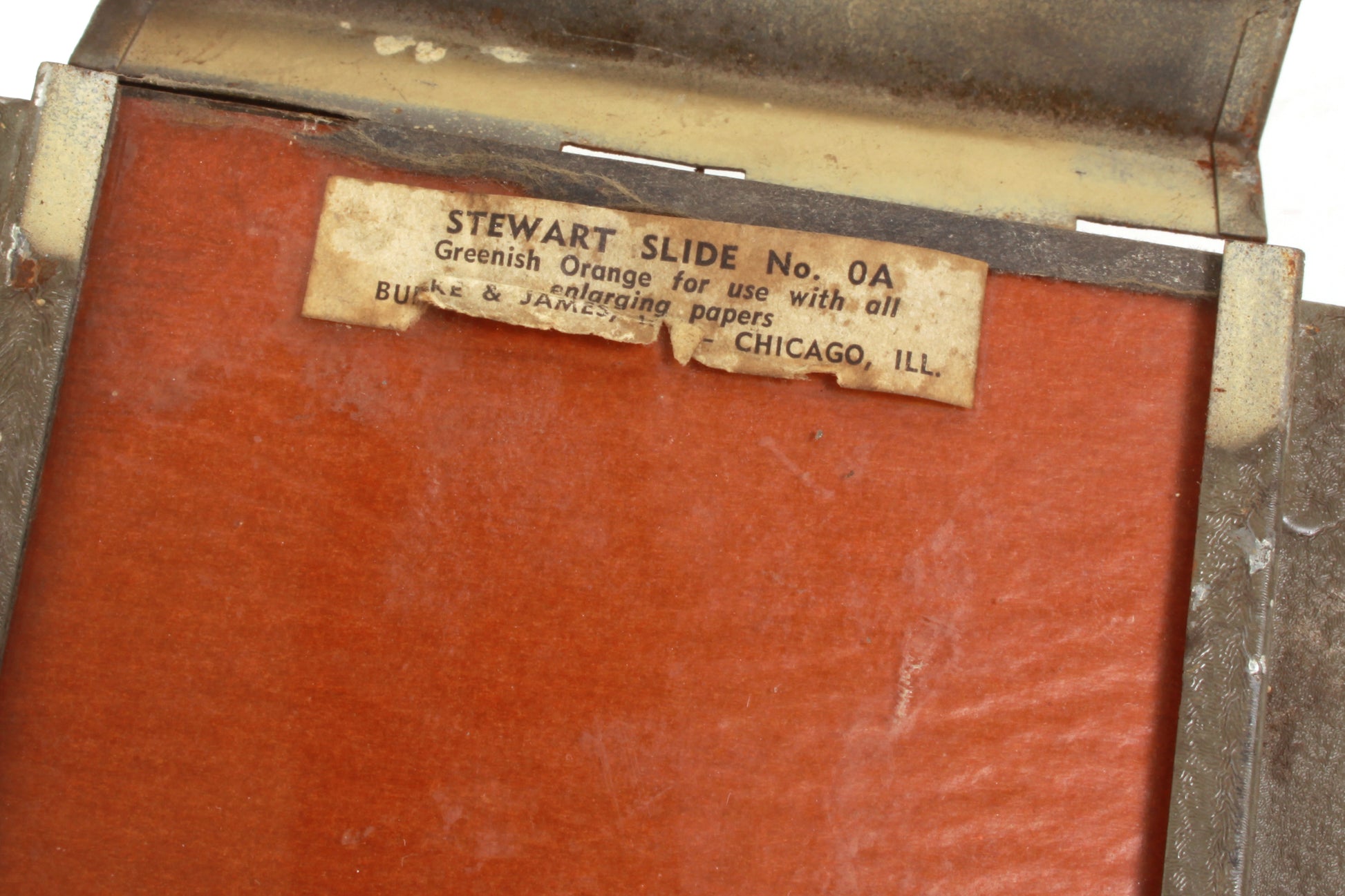 Darkroom safelight. In working order. It measures approximately 7 x 5 1/4 x 5 1/4 inches. Includes bulb and Stewart Slide No. 0A. Cosmetically it has some general wear and tear, the cable shows some cracking and there is some damage at the end of the cable which has some duct tape on it. Sold as is.