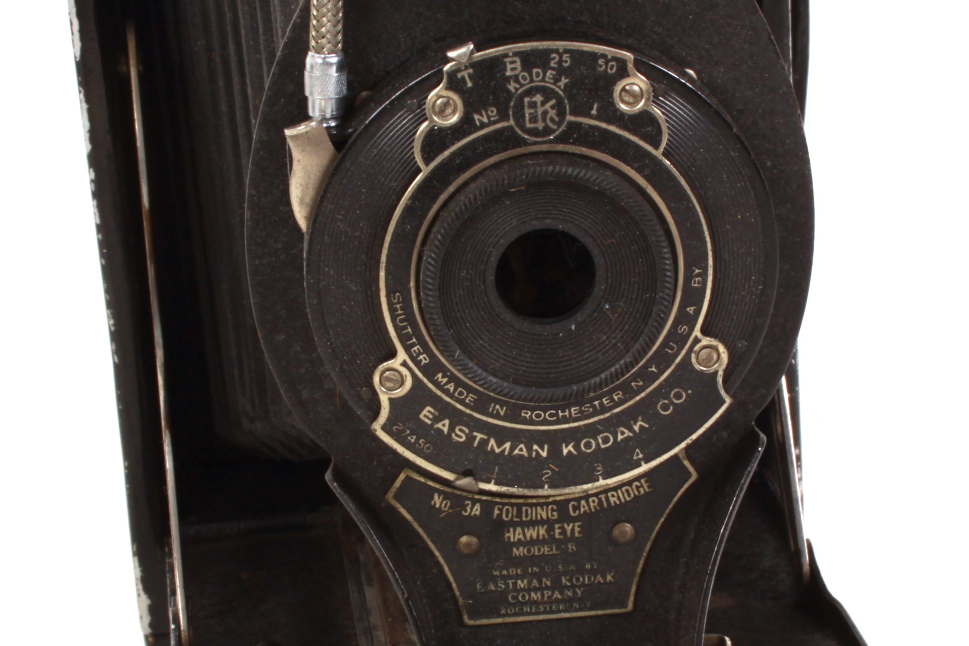 Kodak No.3A Folding Cartridge Hawk-Eye Model B camera. The shutter seems to be working fine on all settings, although it has not been tested with film or for accuracy. Comes with shutter release cable which is working. Aperture movement is smooth. Cosmetically the camera has some general signs of age and use with some wear in places. The bellows have a little wear but no visible holes or tears. There is some dust present to the lens but no haze or scratches. The viewfinder has some dust and haze but no cracks. Sold as is.