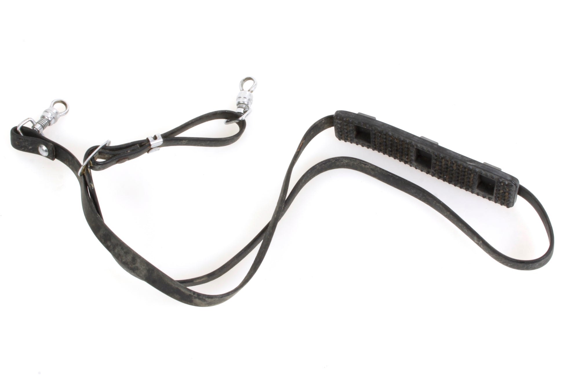Vintage black vinyl camera strap with rubber pad and metal safety clips. Strap measures approximately 3/8 inch wide and 38 inches long. In good vintage condition with some marks and general signs of use.
