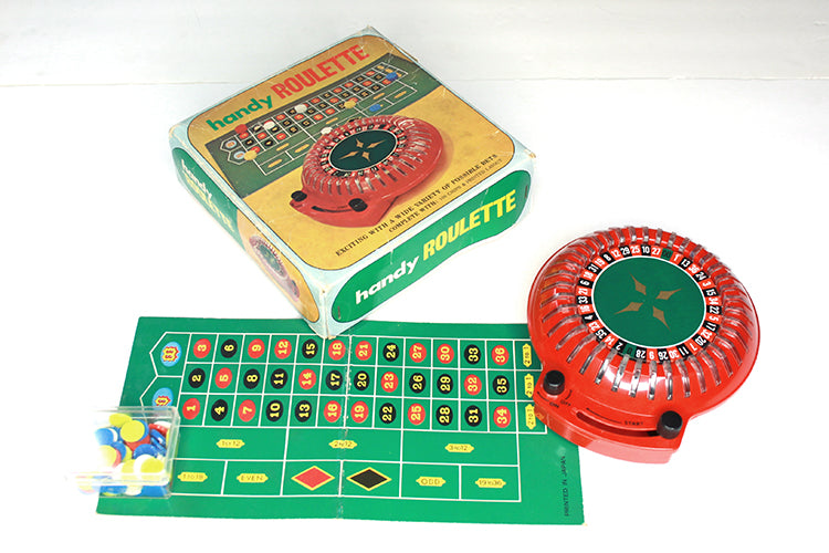 VINTAGE HANDY ROULETTE SET. INCLUDES WHEEL, BOARD AND CHIPS. ALL ITEMS ARE IN VERY GOOD VINTAGE CONDITION. THE WHEEL TAKES TWO AA BATTERIES (INCLUDED) AND IS IN WORKING ORDER. COMES WITH ORIGINAL BOX (SOME DAMAGE TO BOX AND SOME WRITING TO THE UNDERSIDE).