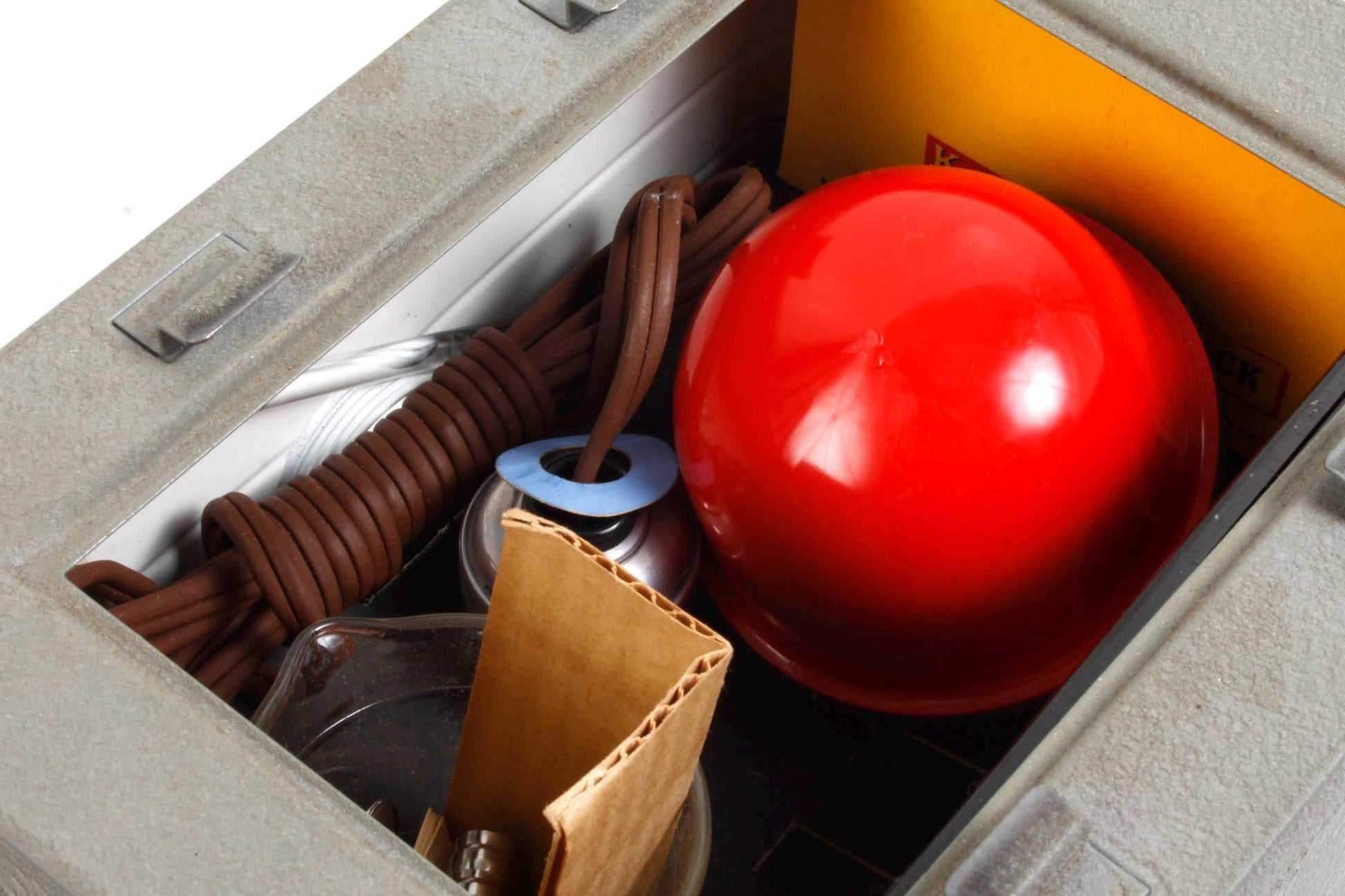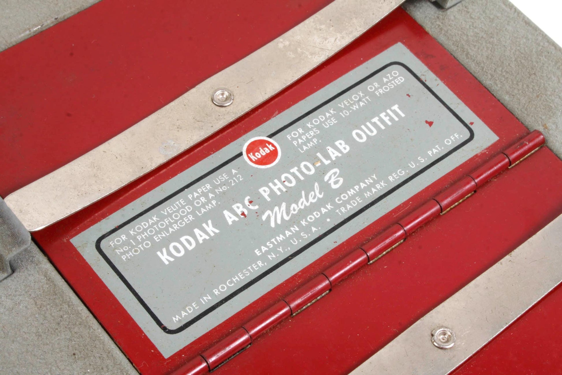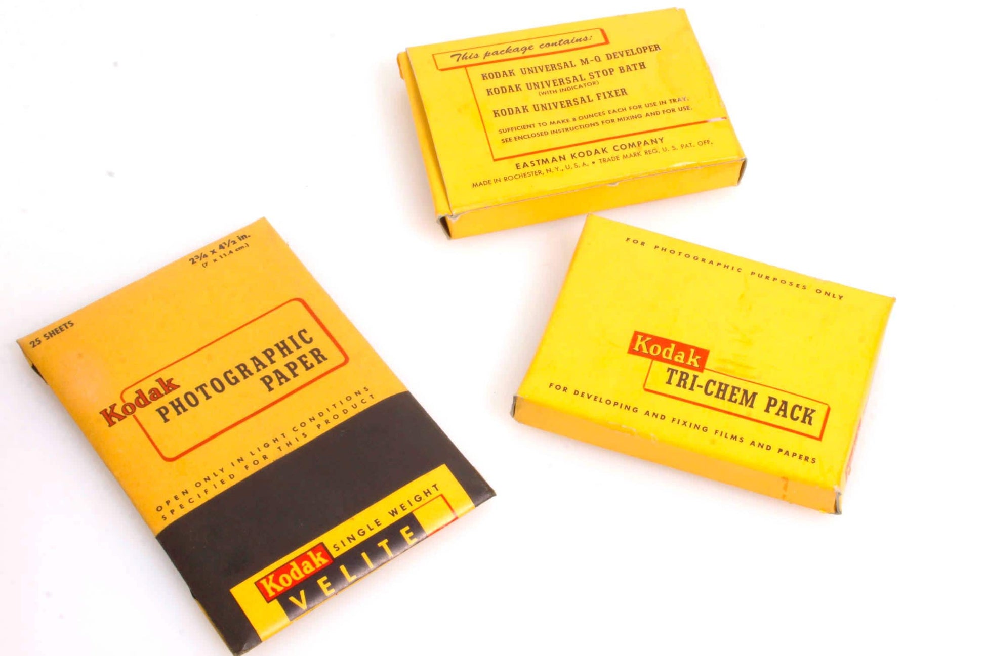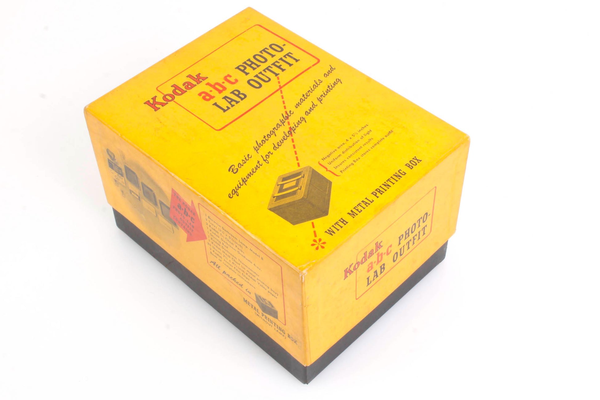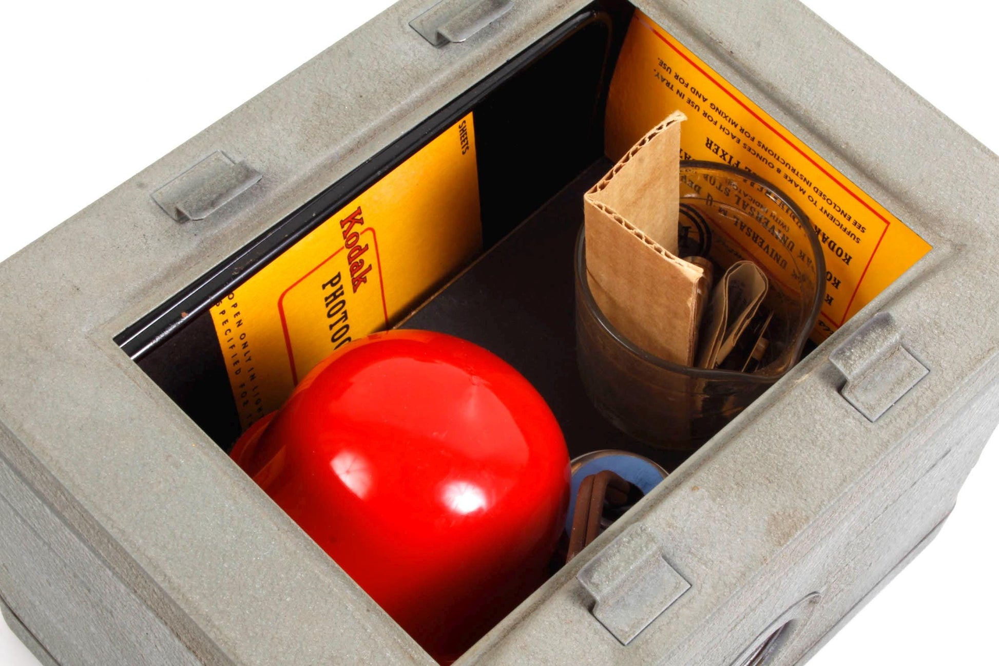 Vintage Kodak box lab. Comes with a darkroom safelight, Beaker, Negative drying clips, stirrer, expired photo paper and a variety of developing chemicals that are also expired. The Box the kit comes in is quite nice and could be repurposed for other needs.