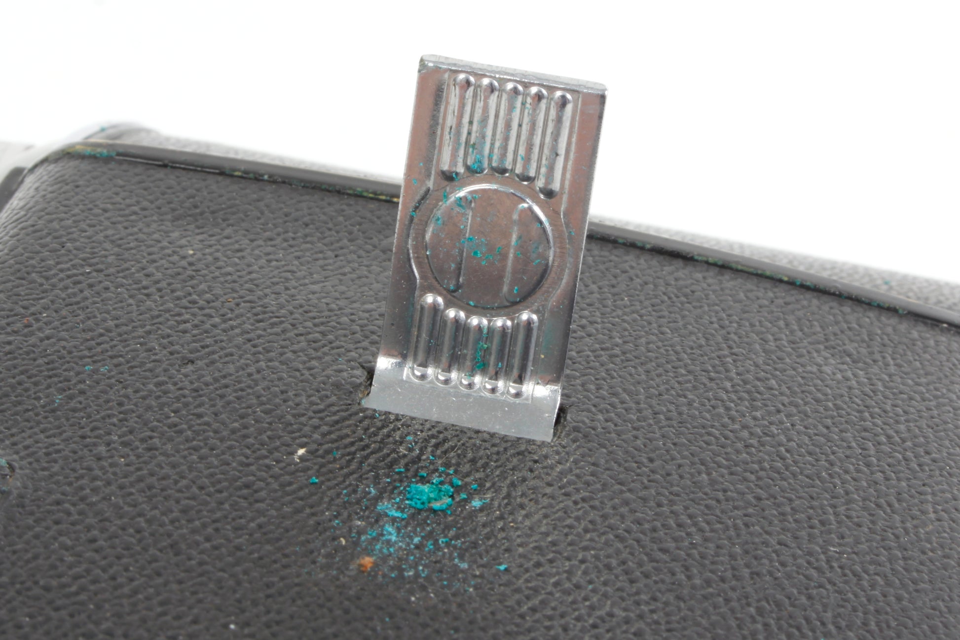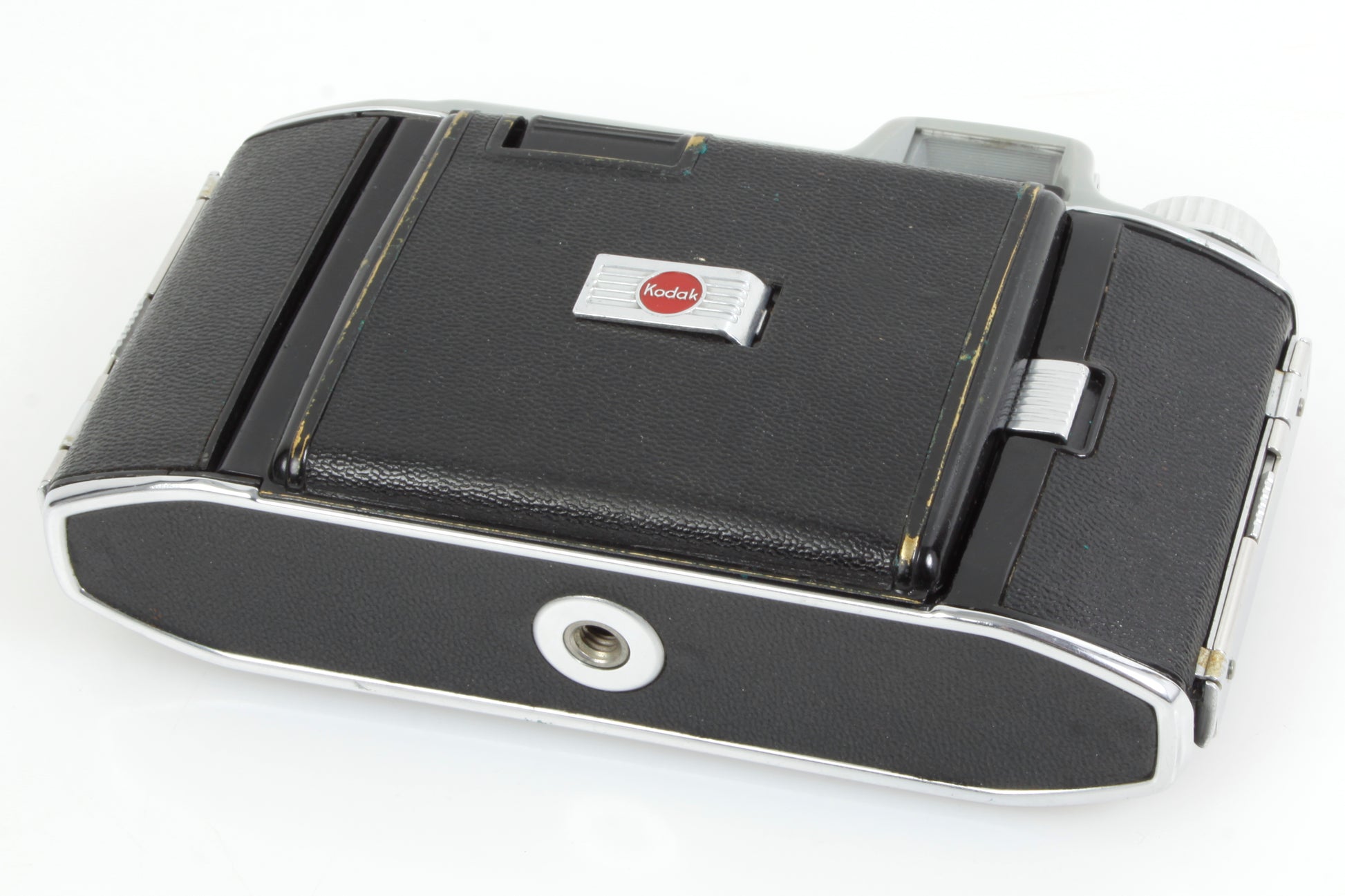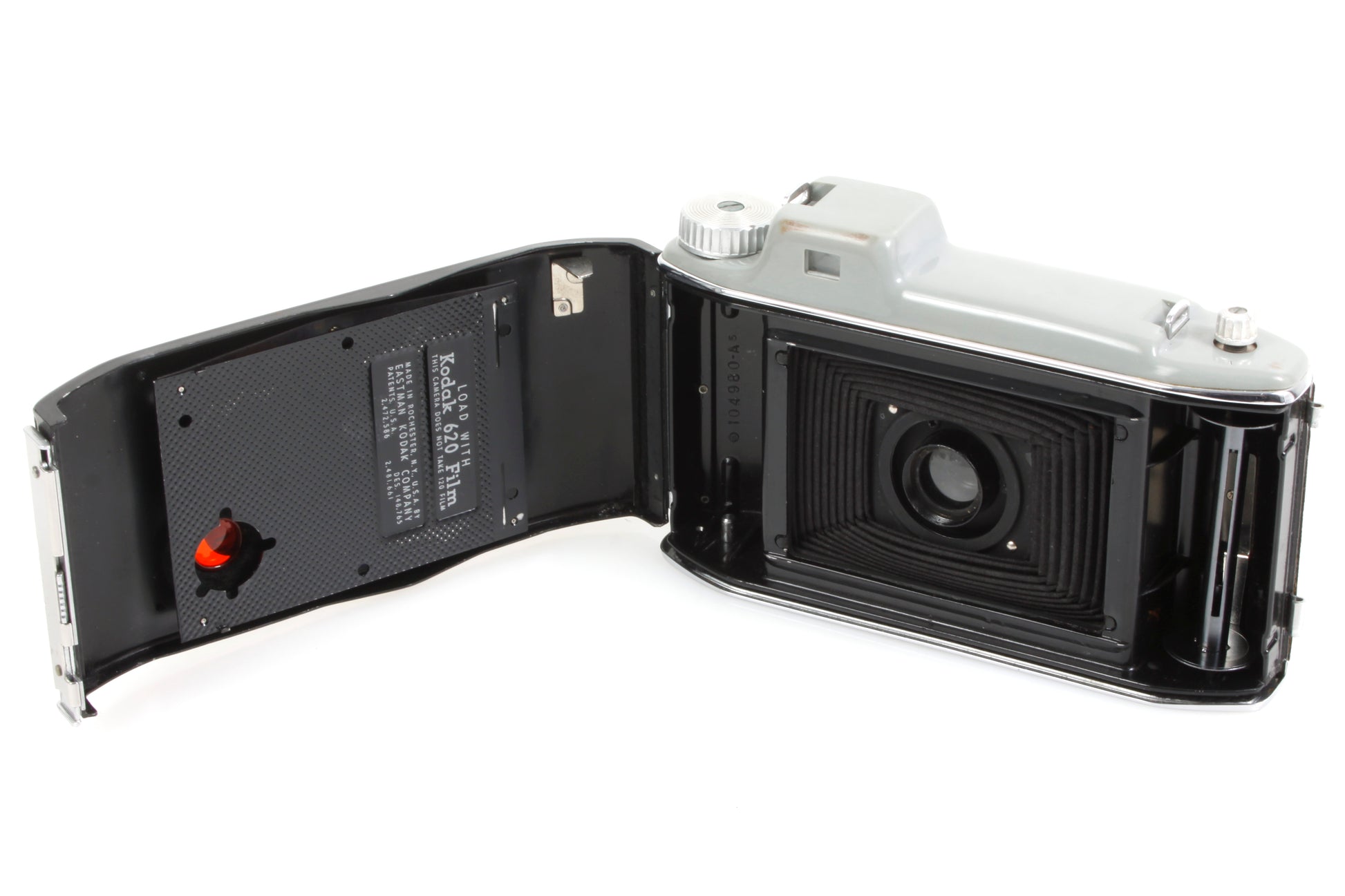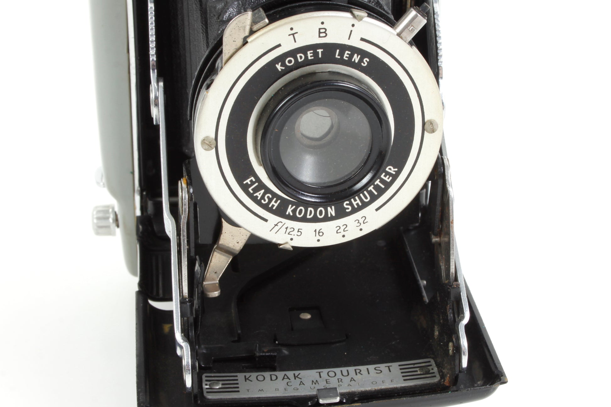 Kodak Tourist camera. The shutter seems to be working fine, although it has not been tested with film or for accuracy. Cosmetically it is in good vintage condition with some general signs of age and use. Some areas of oxidation to metal parts. No visible holes or tears to the bellows. Some dust and haze to the lens but no scratches. Some haze to the viewfinder but no cracks. Comes with one roll of film (expired so we cannot guarantee its condition or usability).