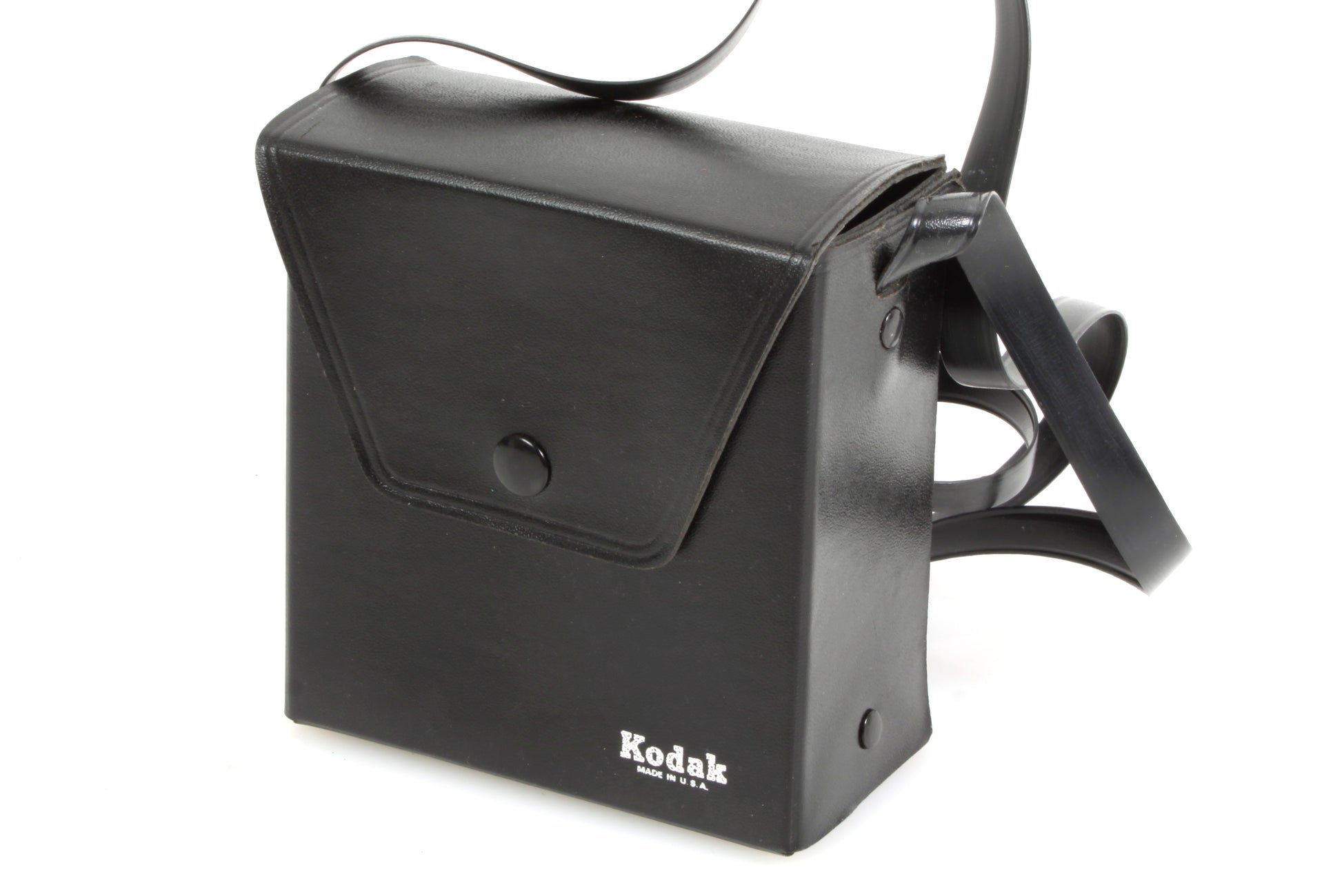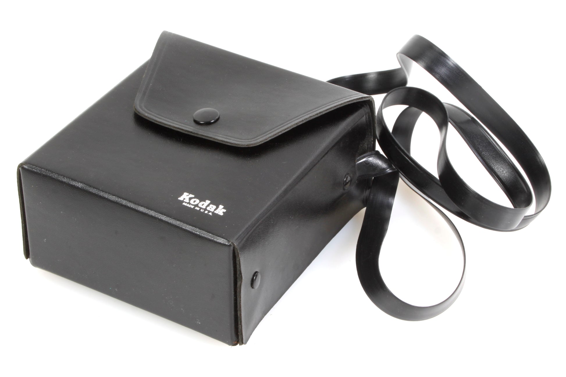 Kodak black case with strap. Exterior measurements approximately 5 x 4 3/4 x 2 1/2 inches. The interior is split into two sections which measure approximately 4 7/8 x 3 x 2 1/4 inches and 4 7/8 x 1 1/4 x 2 1/4 inches. In good vintage condition with some general signs of use. There is a small piece of tape to the interior. The strap is a little bent due to having been folded up in storage.