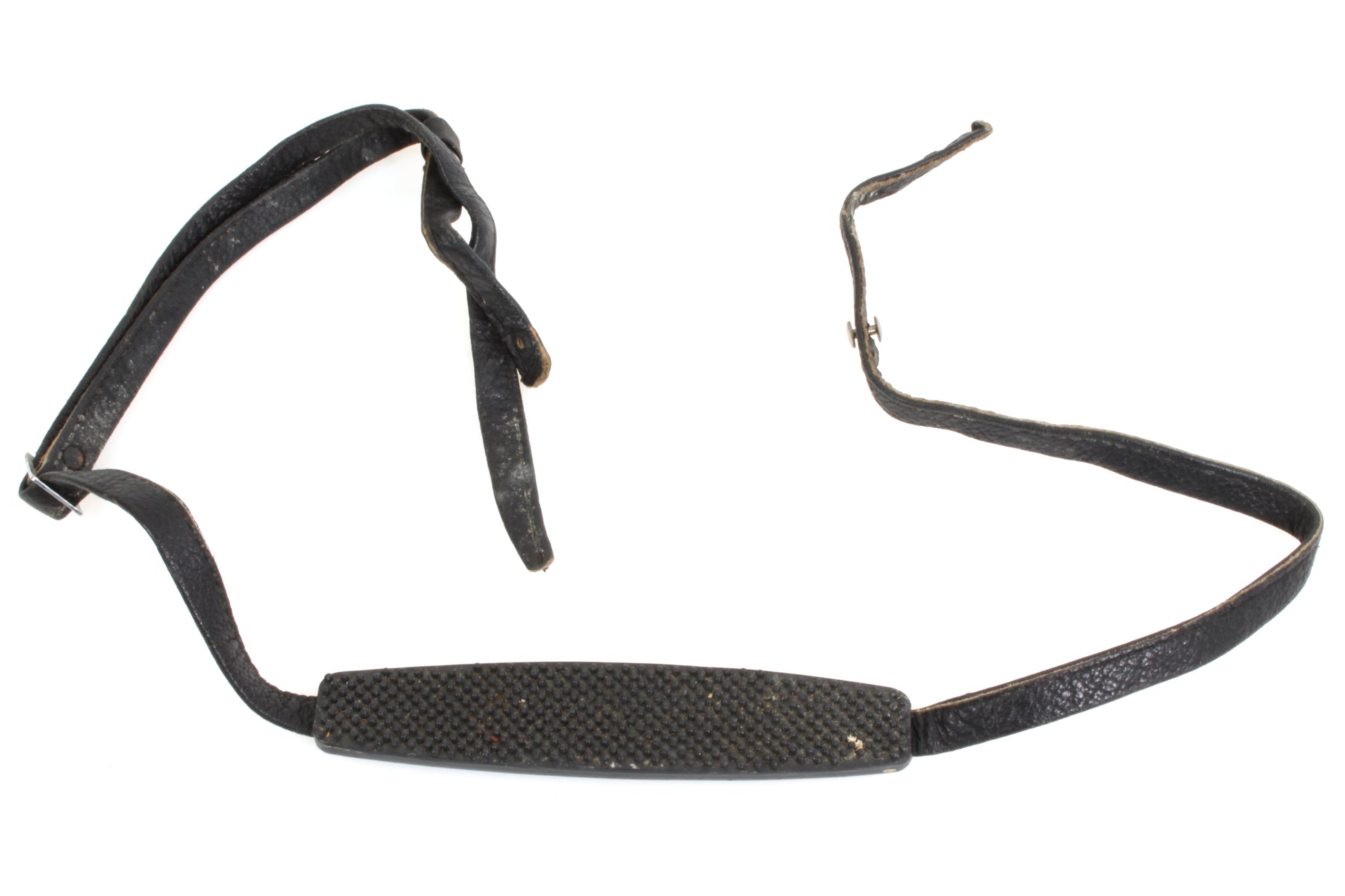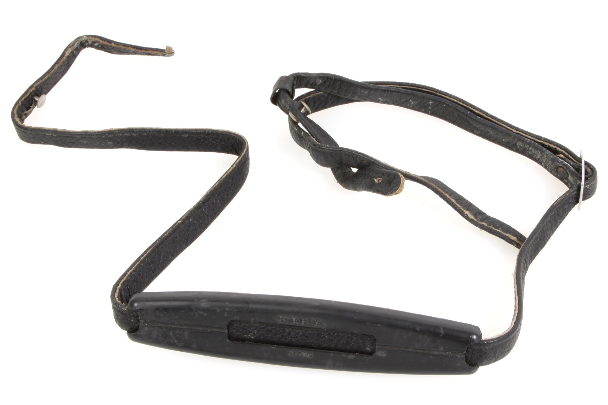 Konica black leather camera strap with rubber pad. Strap measures approximately 7/16 inch wide and 40 inches long (at its longest - length is adjustable). In good vintage condition with some wear and general signs of use and some rust to some of the metal parts.
