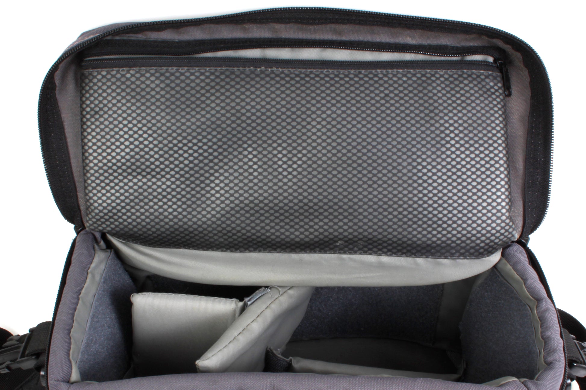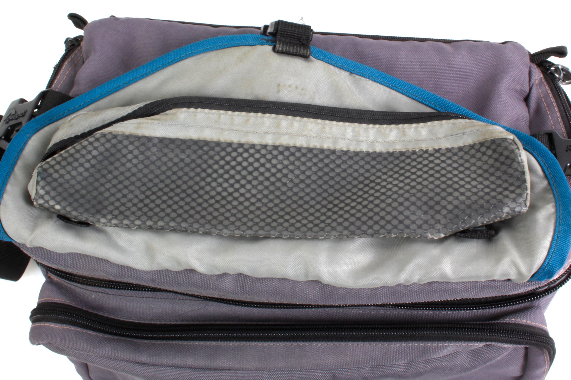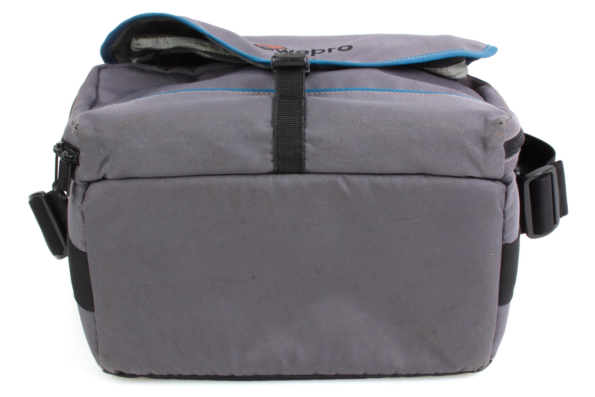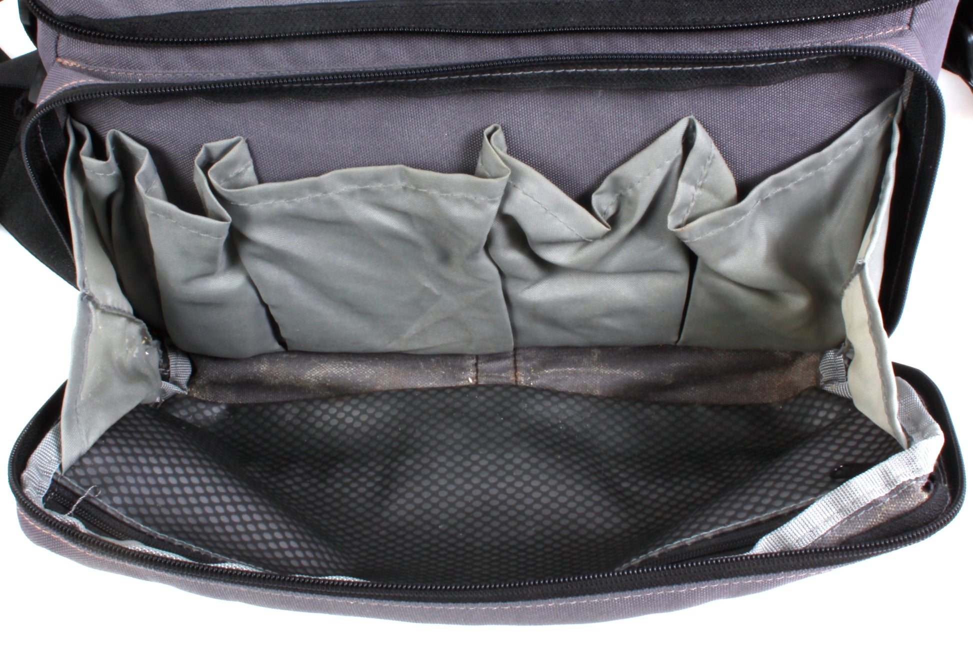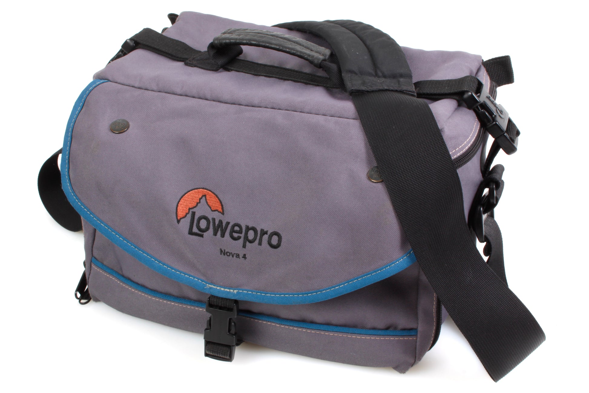 Lowepro Nova 4 gray and black camera bag with shoulder strap. Main compartment interior measures approximately 11 x 6.5 x 5 inches. Exterior measures approximately 12 x 8.5 x 8 inches. In good vintage condition with some general signs of use.