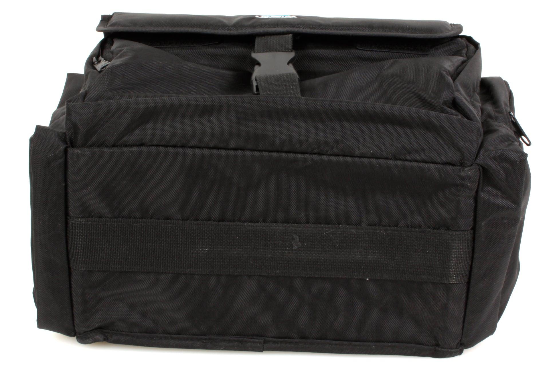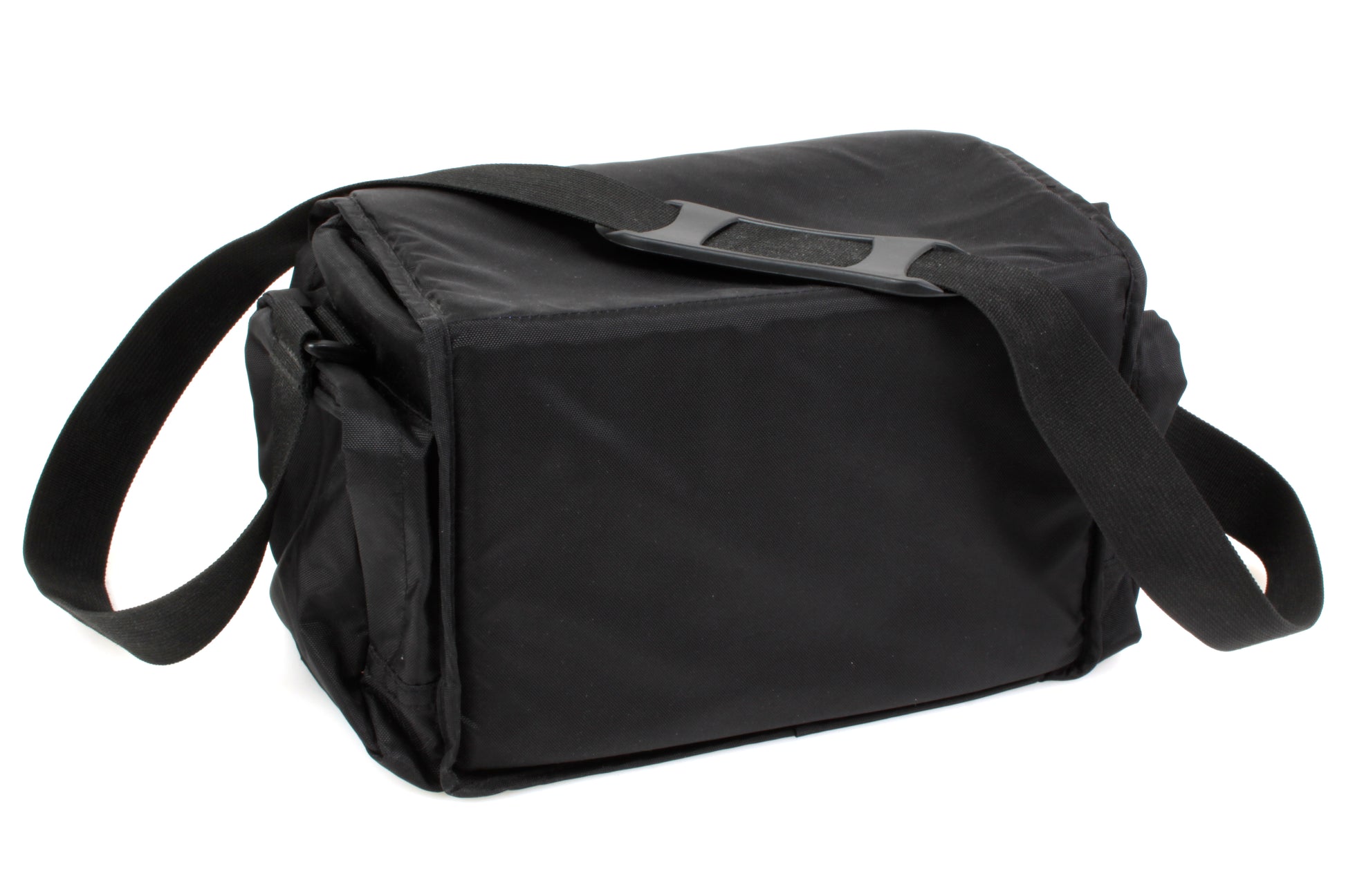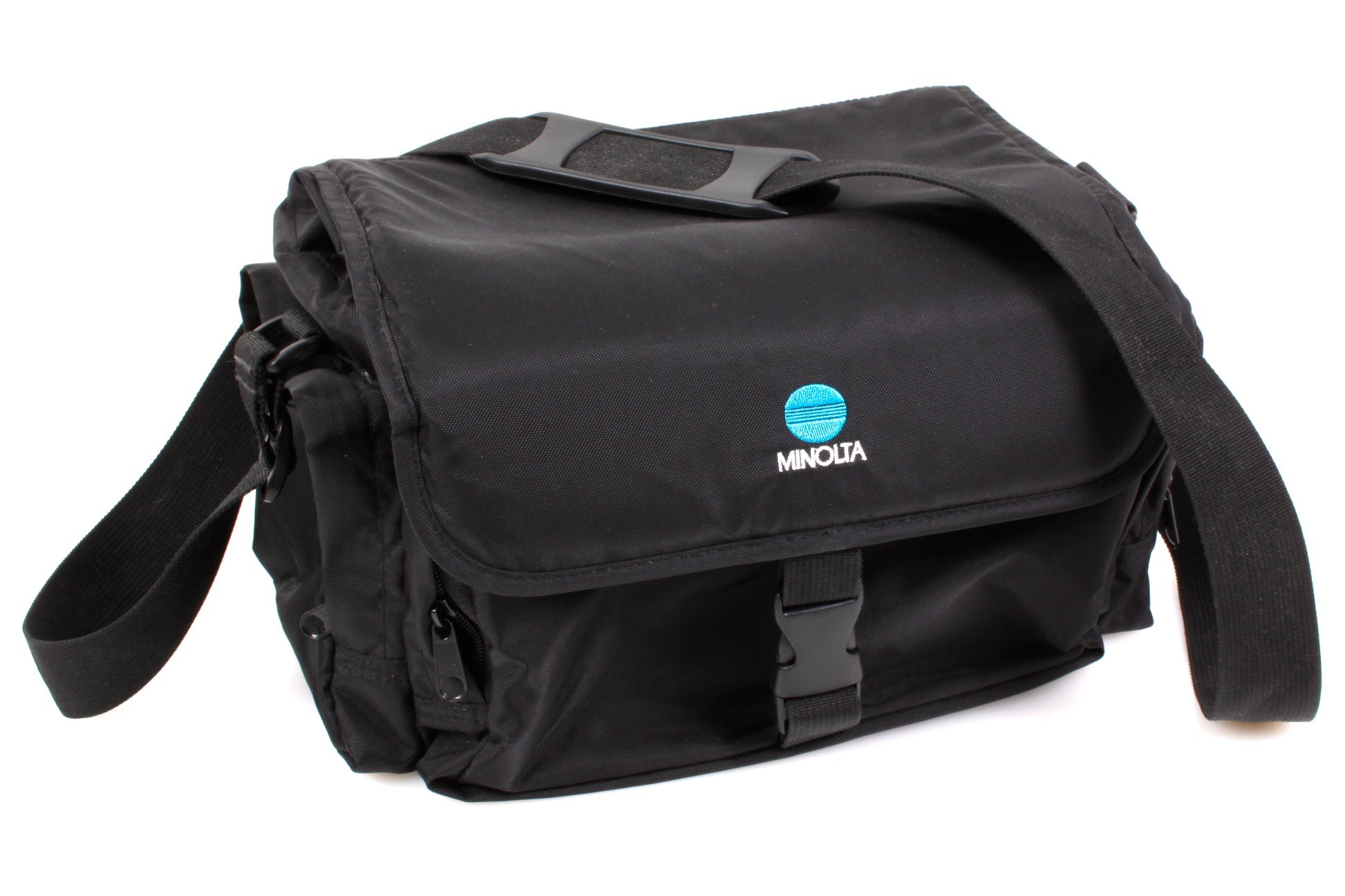 Minolta black camera bag with adjustable shoulder strap. It comes with one removable divider. Overall measurements approximately 12.25 x 7 x 7 inches. Interior measurements approximately 10 x 6.5 x 5 inches. In excellent vintage condition. Looks like it hasnt even been used.