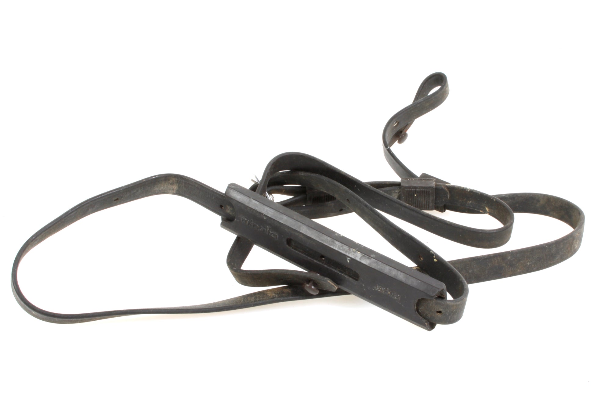 Vintage Minolta black vinyl camera strap with rubber pad. Strap measures approximately 7/16 inch wide and 46 inches long. In good vintage condition with some marks and general signs of use. (May vary slightly from the one shown in photos - will be picked at random).