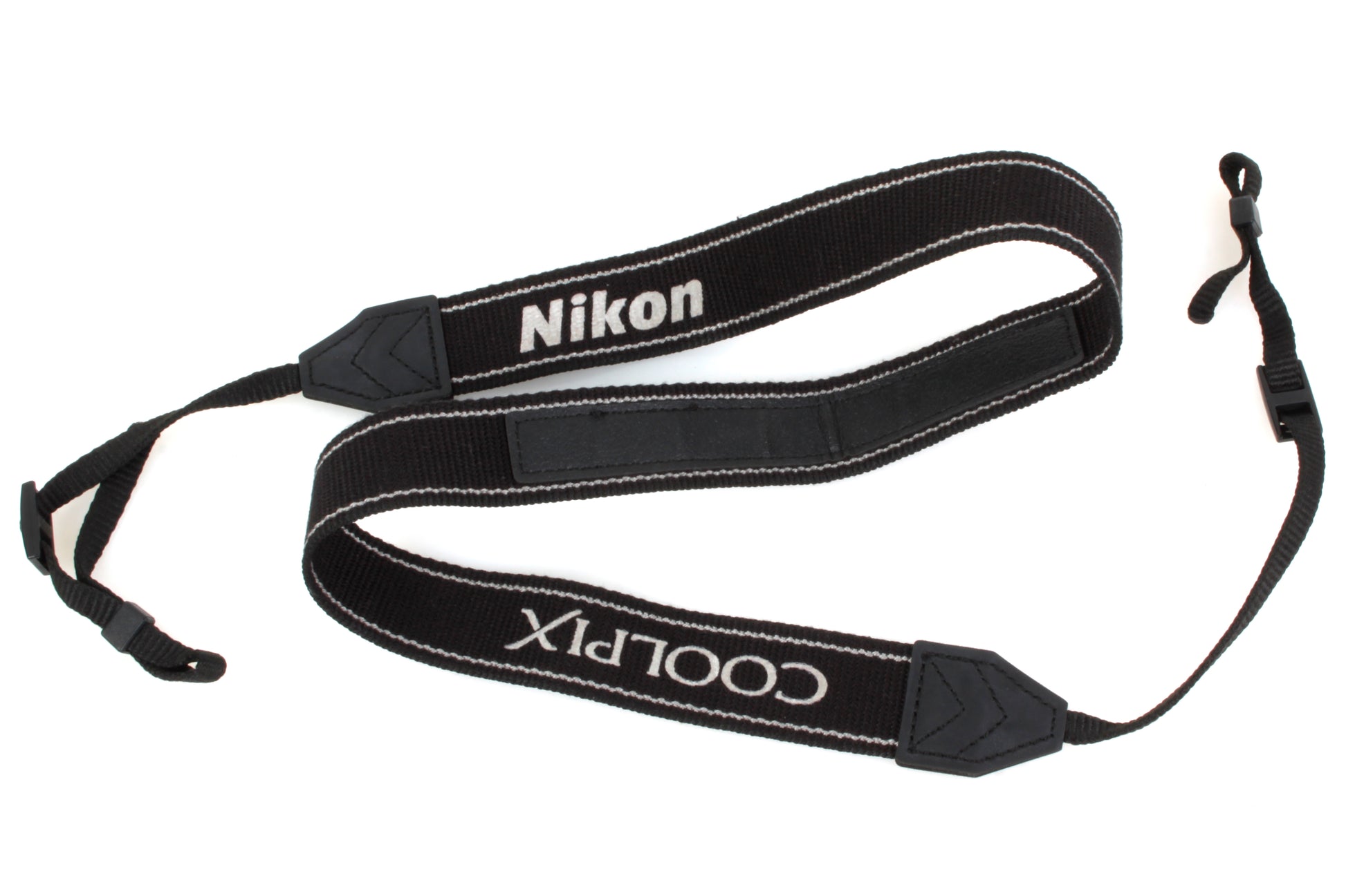 Black and gray Nikon Coolpix camera strap. Measures approximately 1/4 inch wide at the narrow part, 1 1/16 inches at the wide part and 40 inches long. In very good vintage condition with only light signs of use.