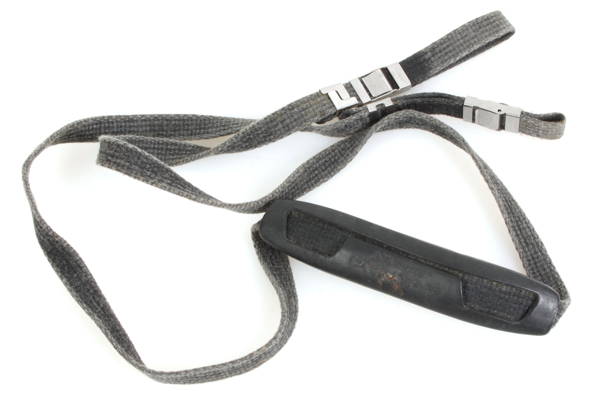 Asahi Pentax gray camera strap with black rubber pad. Strap measures approximately 1/2 inch wide and 45 inches long. This is a vintage item with some marks and general signs of use, some cracking to the rubber pad.
