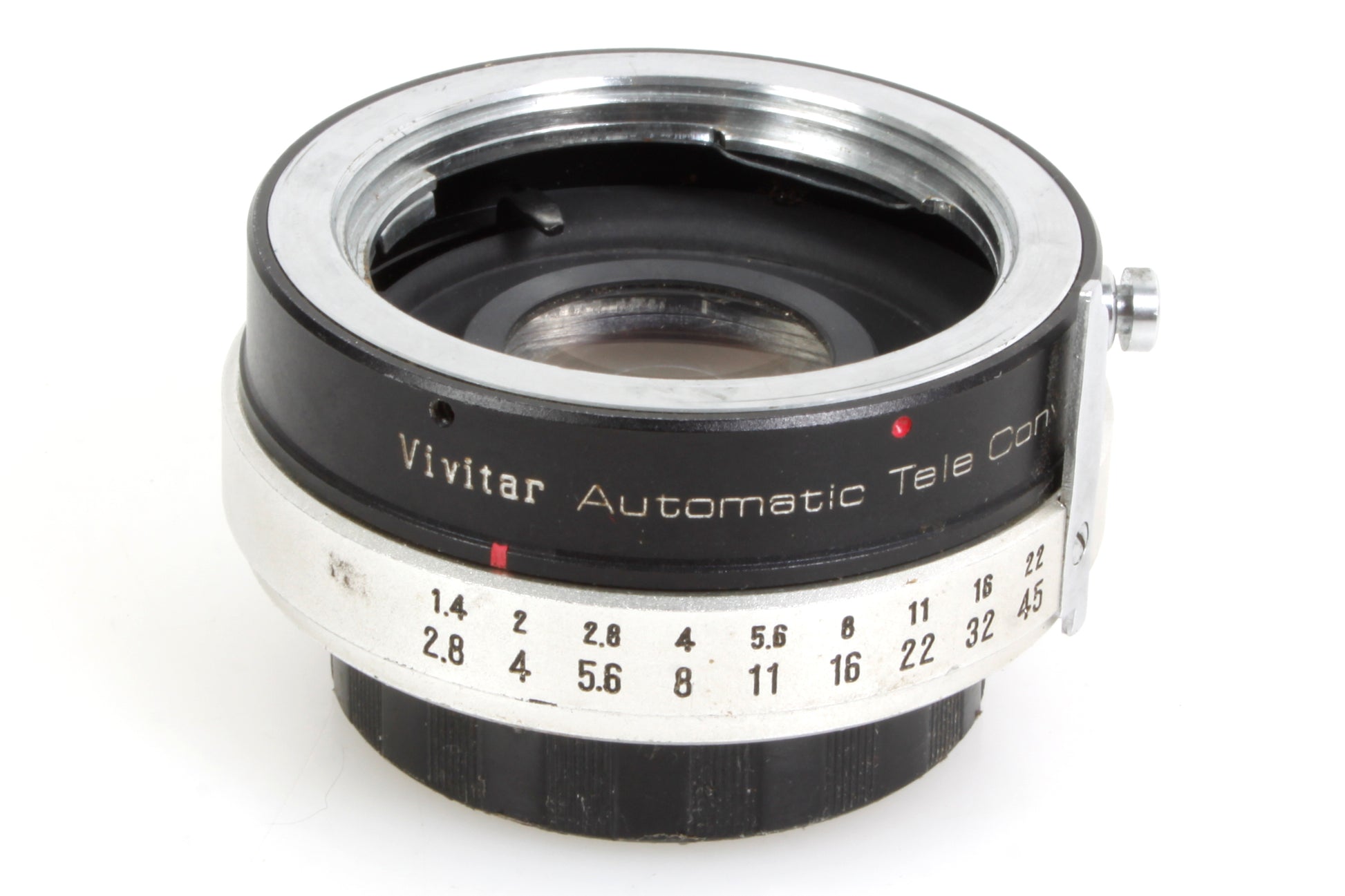 Vivitar Automatic Tele Converter 2X-6. There is some dust and haze present to the lens but no fungus or scratches. The barrel is in good vintage condition with some scratches and general signs of use. Comes with rear cap.