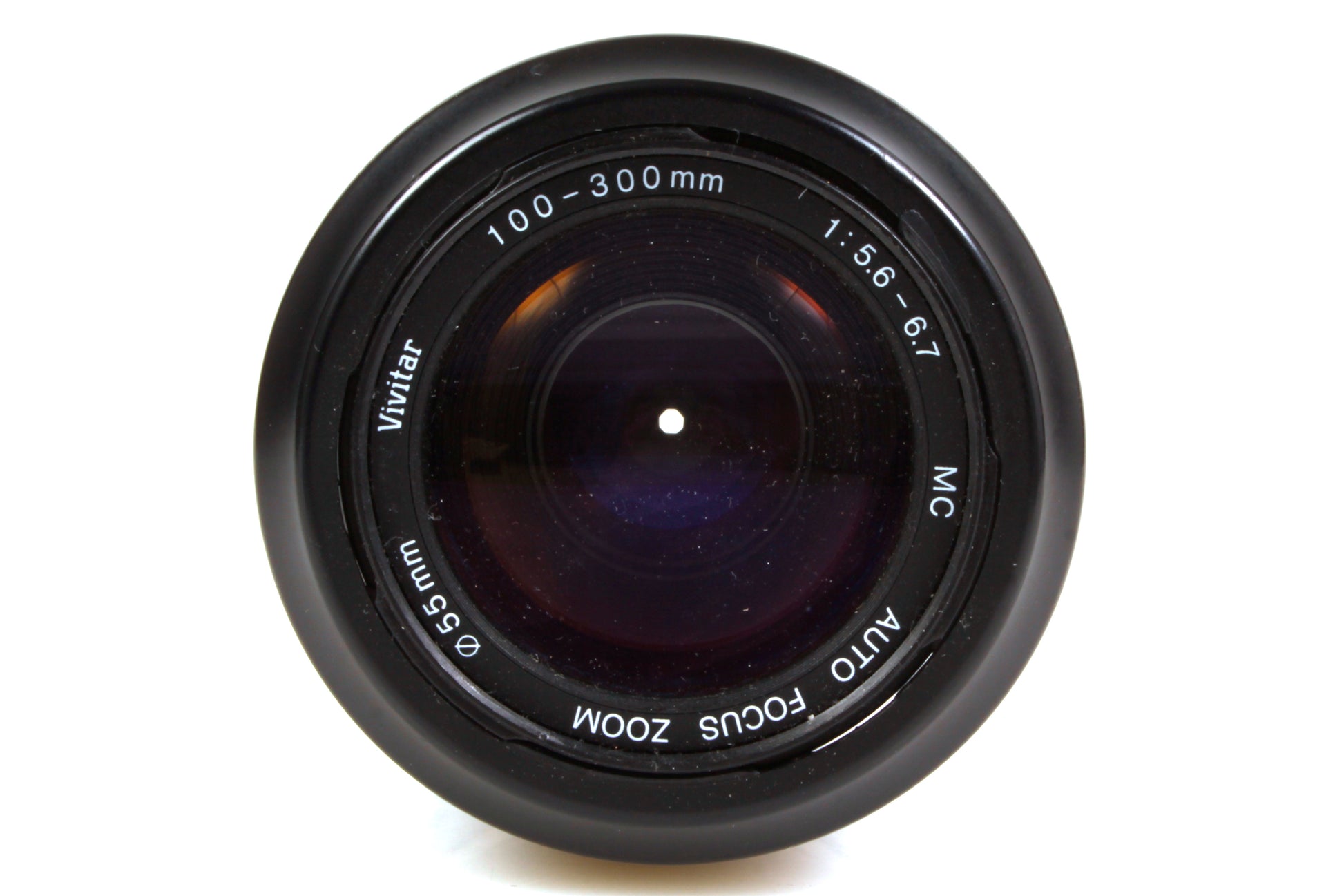 Vivitar 100-300mm 1:5.6-6.7 lens. There is some dust and haze present to the lens but no fungus or scratches. Cosmetically it is in good vintage condition with some scratches and general signs of use. Comes with rear lens cap and lens hood.
