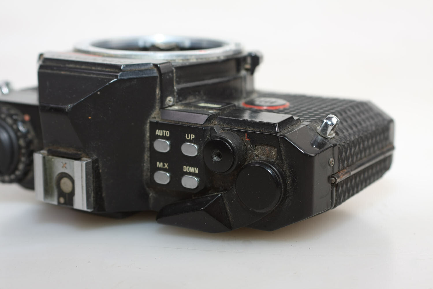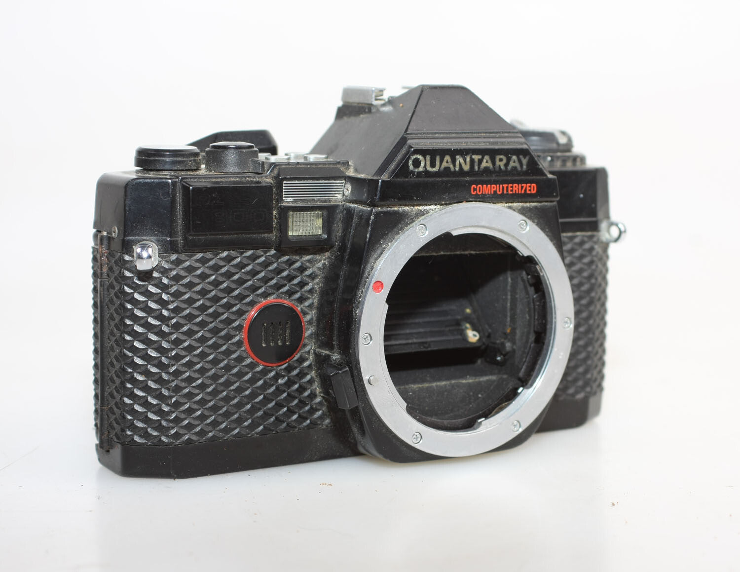 The Quantaray has some rust and a few scratches on the body. The shutter crank is stuck. The back compartment for the film also does not stay closed.