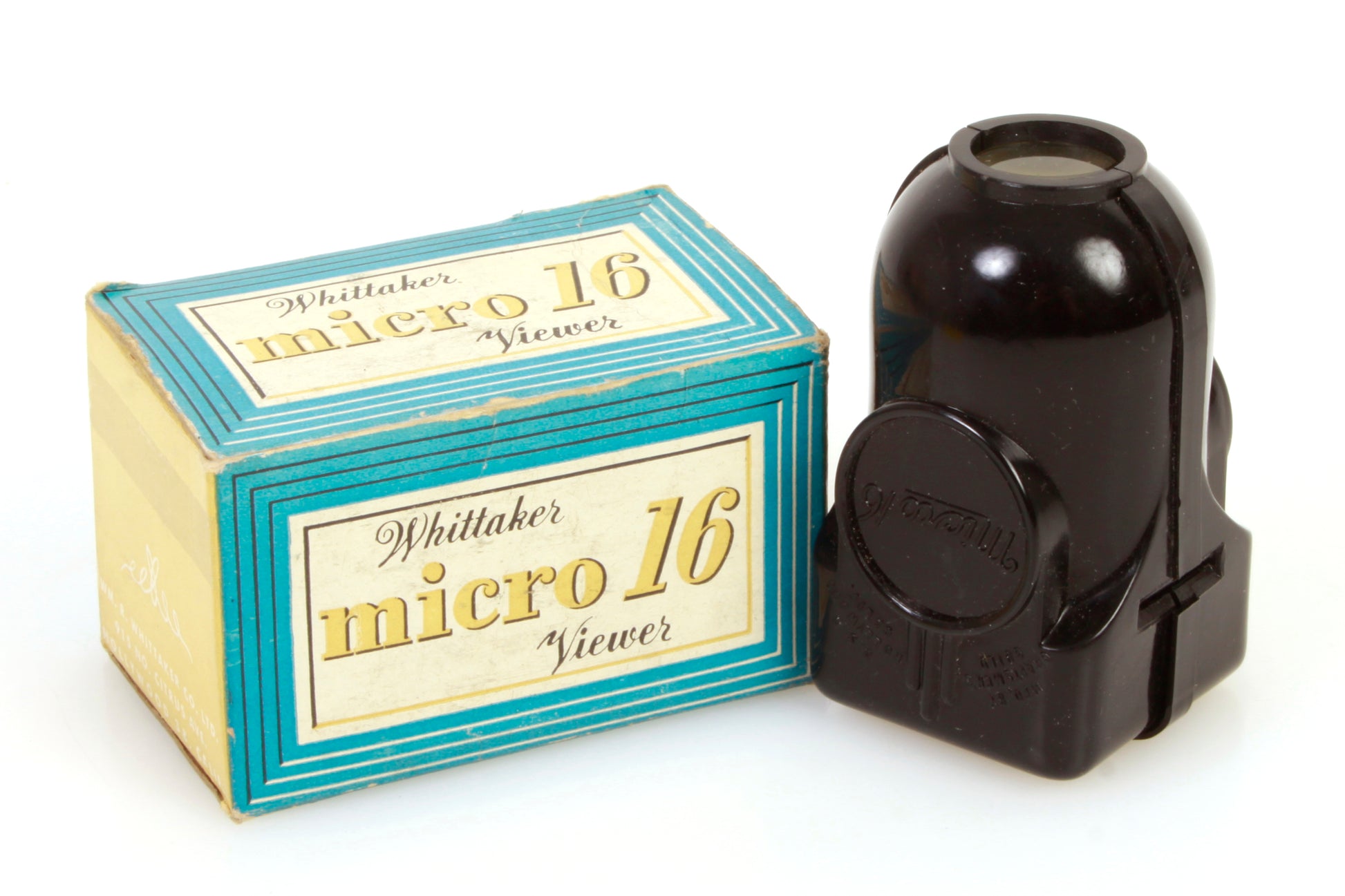 Whittaker Micro 16 Viewer. Measures approximately 2 3/4 x 1 5/8 x 1 5/8 inches. In good vintage condition and it comes with original box.