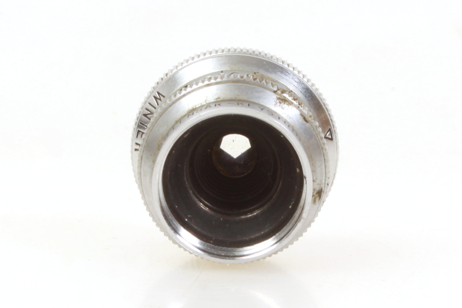Wollensak-Keystone 13mm f/2.5 Cine Raptar lens. There looks to be some dust and haze present to the lens but no scratches. The barrel is in good cosmetic condition with some marks.