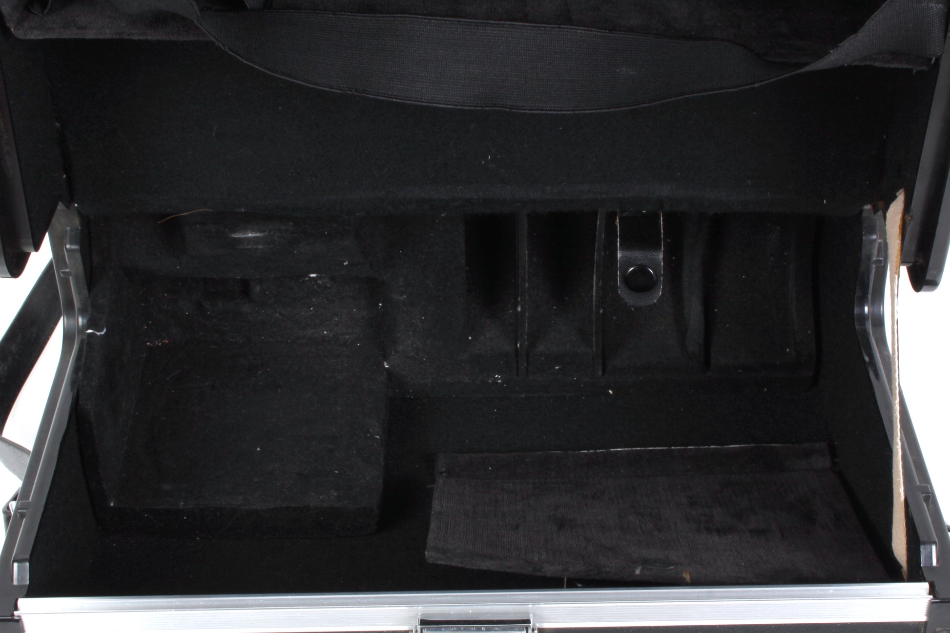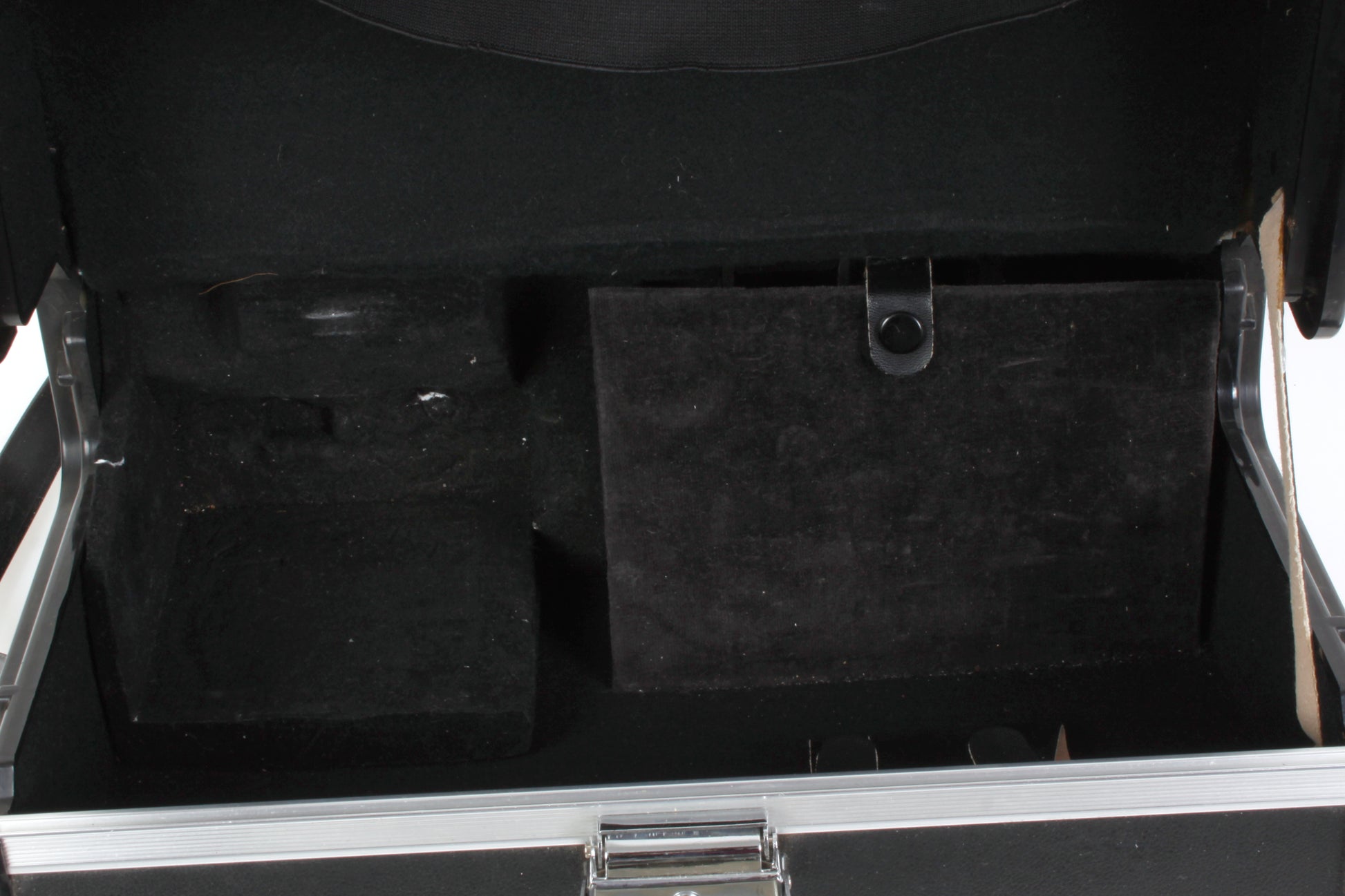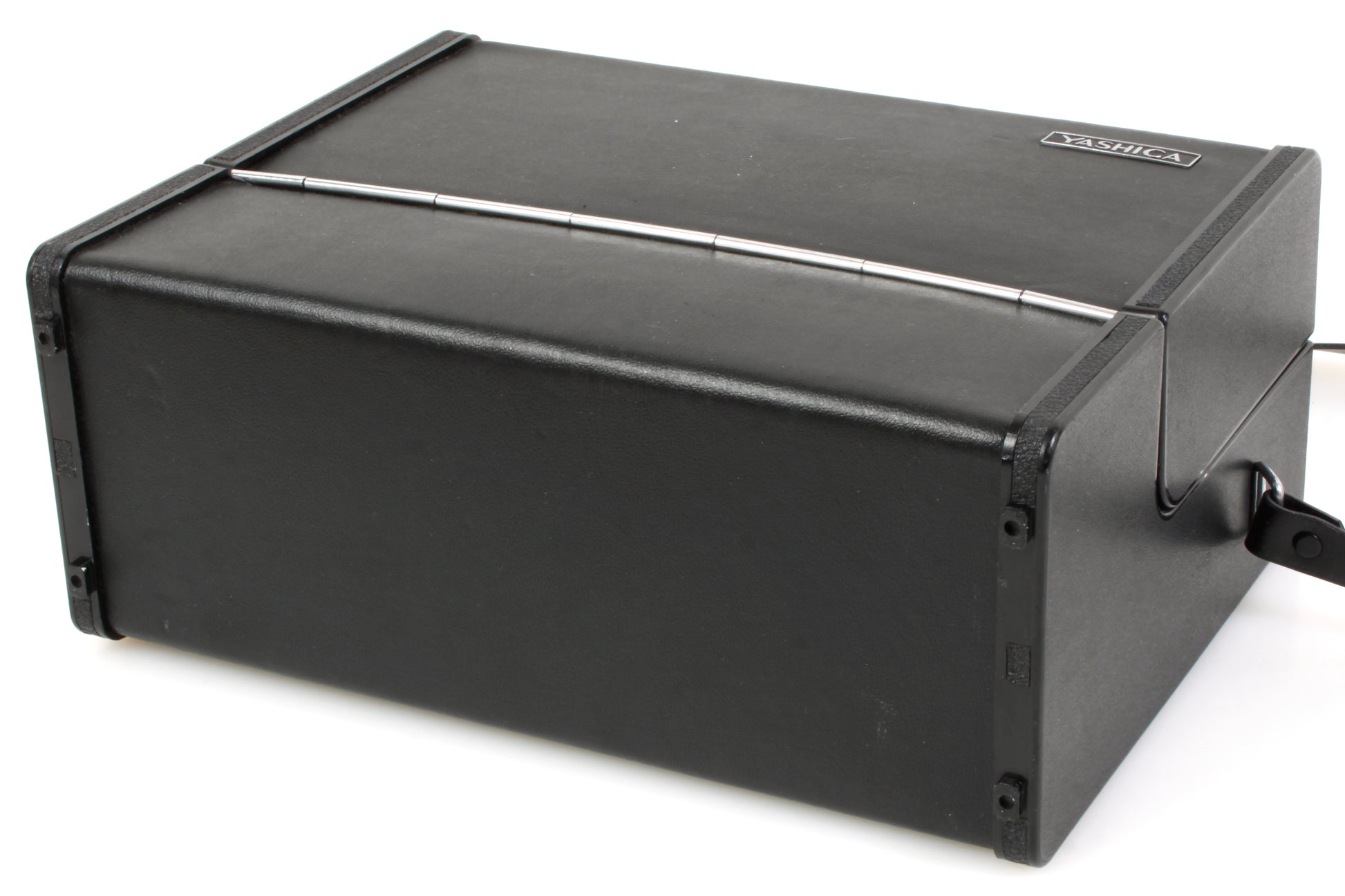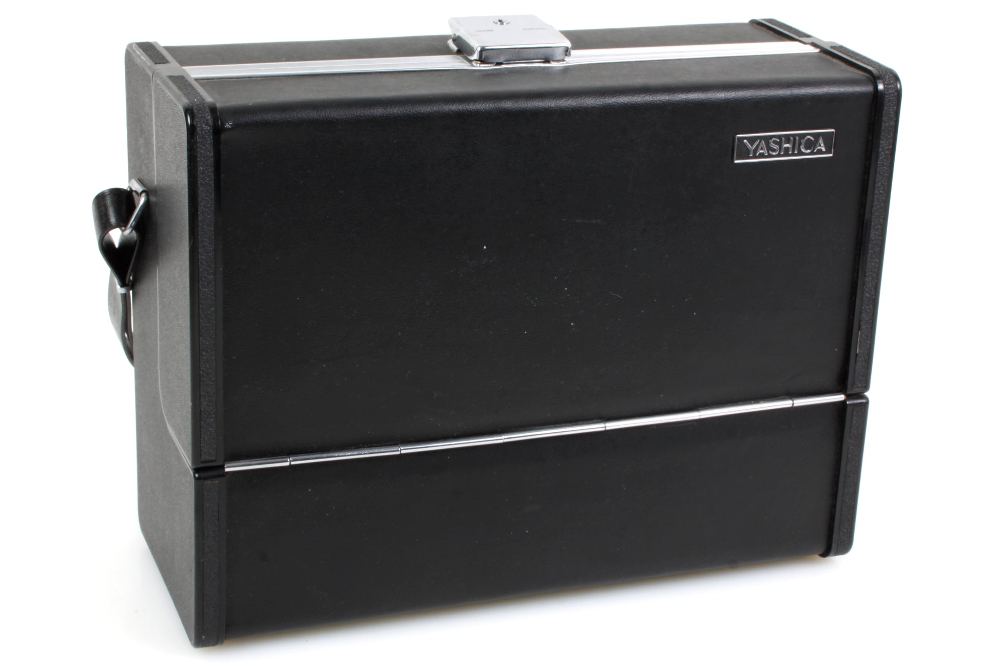 Yashica black case with strap. Overall measurements approximately 11 7/16 x 8 9/16 x 4 3/4 inches. The open part of the interior (not including the fitted areas) measures approximately 10 1/2 x 6 1/4 x 2 1/4 inches. In very good vintage condition with light signs of age and use. Does not come with key.