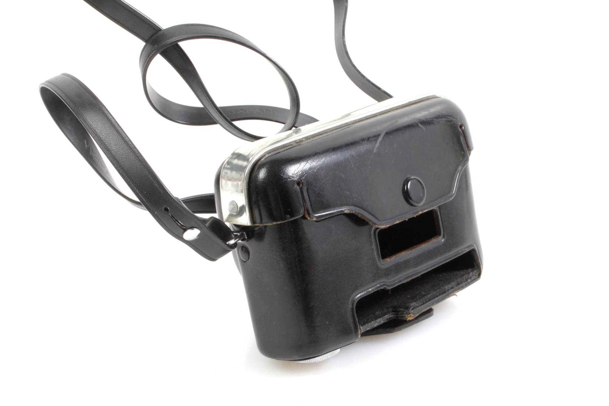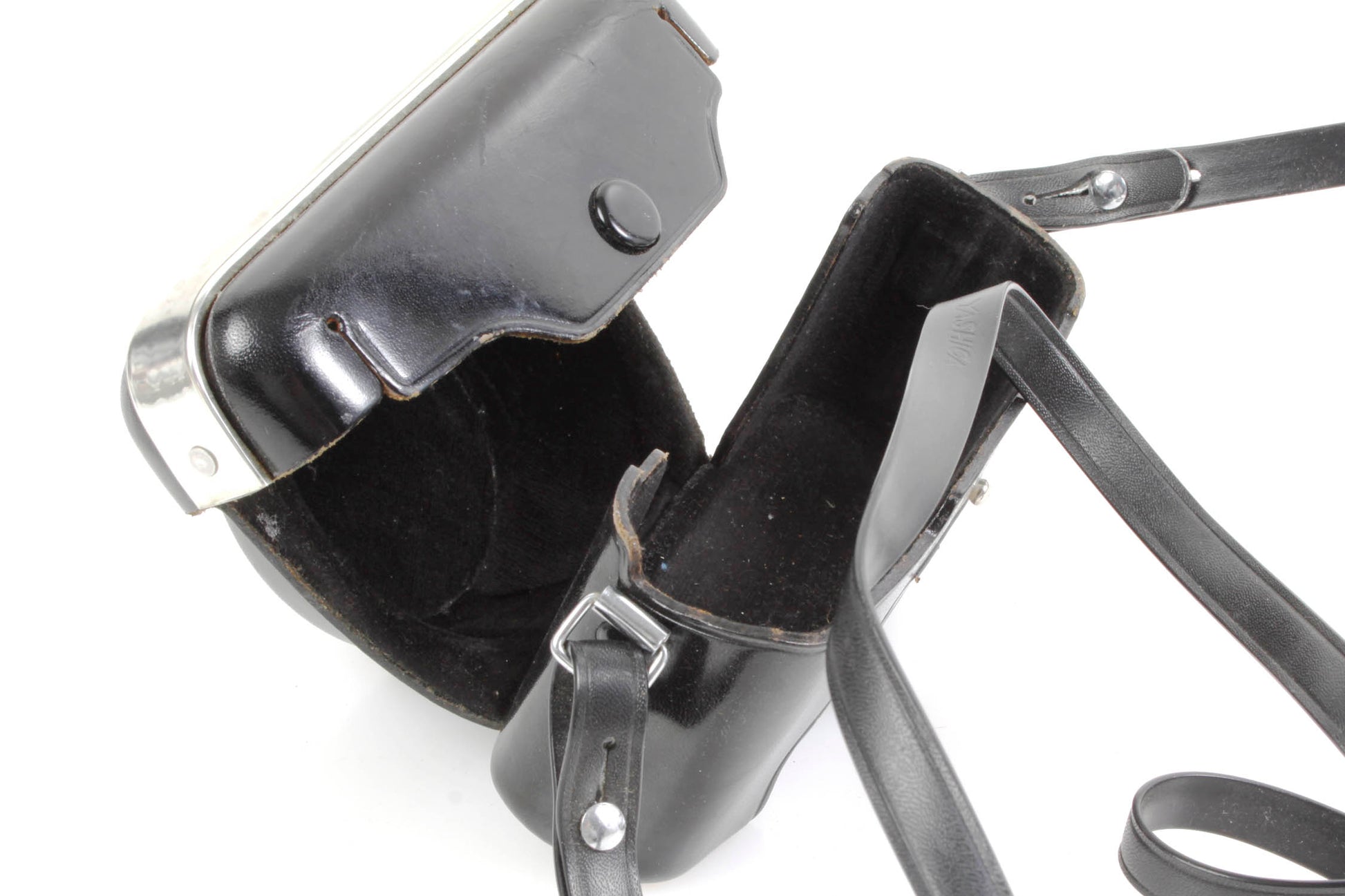 5 X 3 X 3 inch case. In good condition with some general ware and signs of age. Interior is clean. Shoulder strap is sturdy.