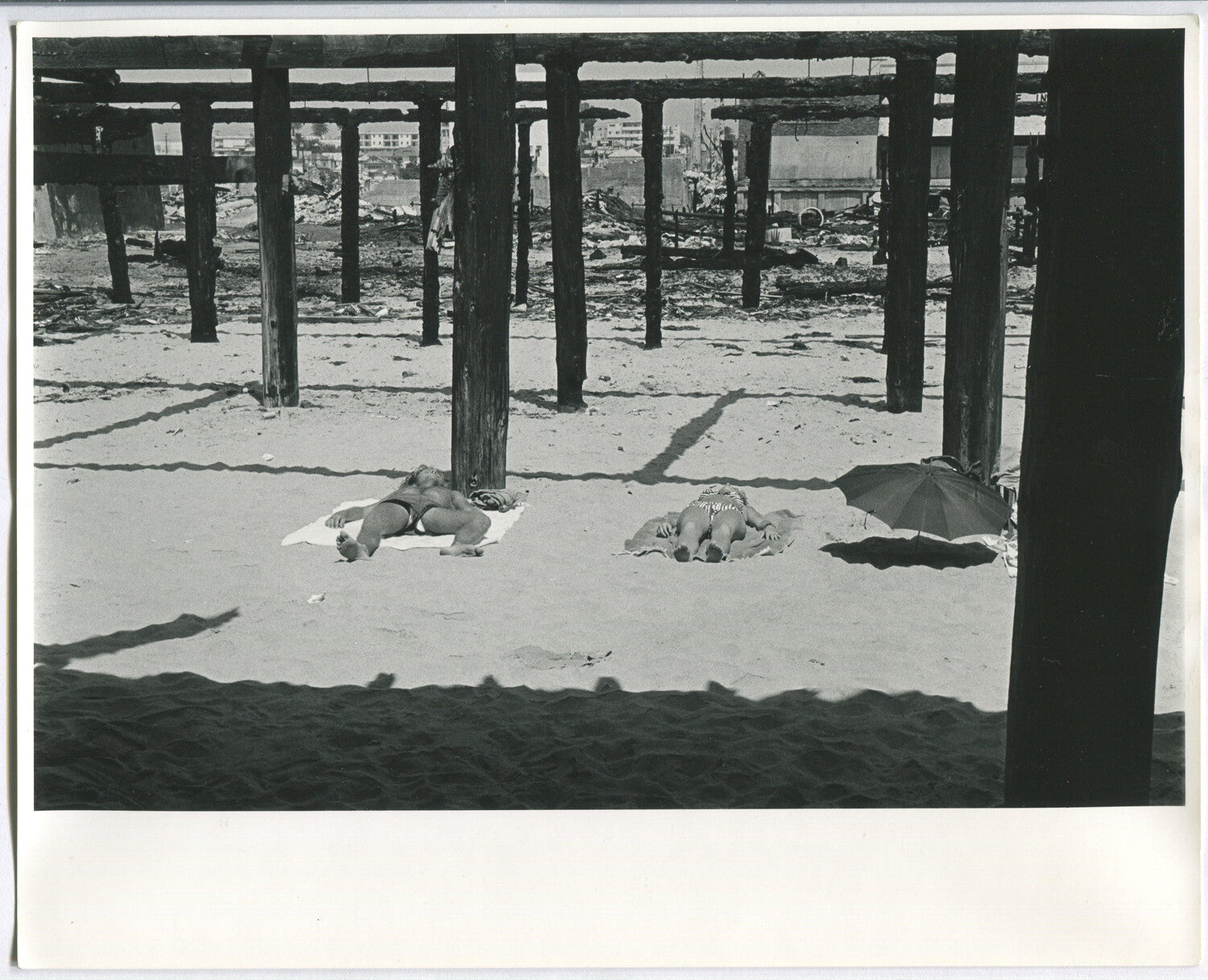 YOUNG COUPLE SUNBATHING, PIER SHADOWS. B&W 8X10.1970s B&W 8x10