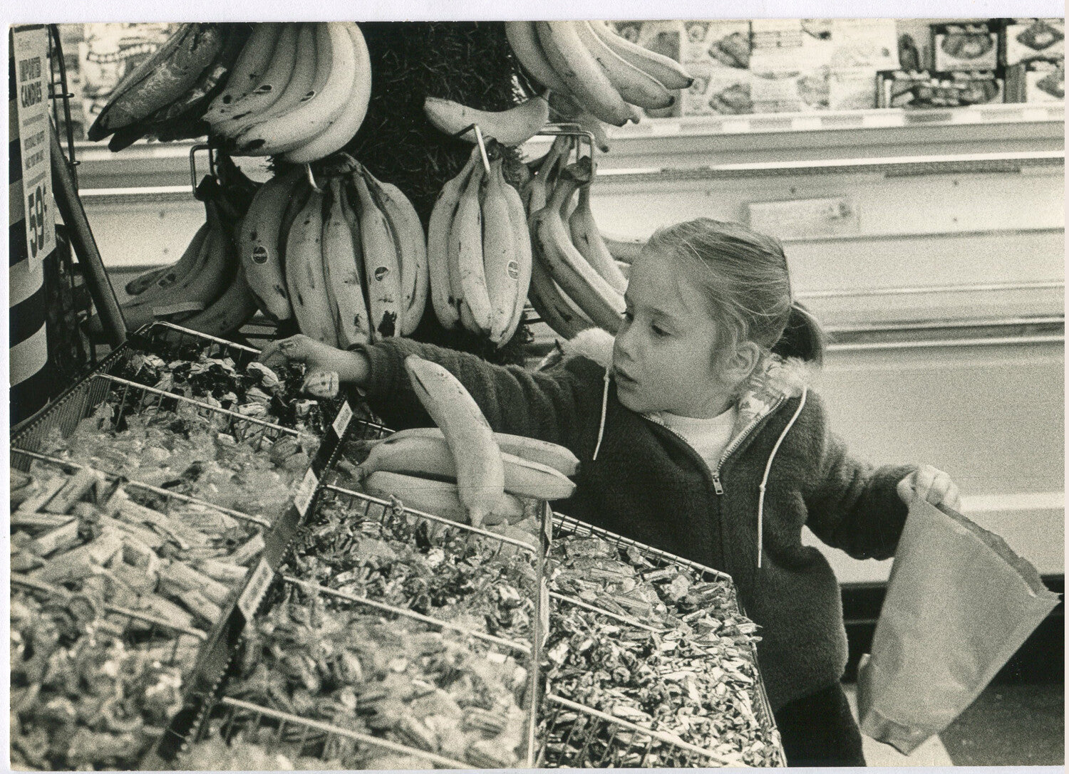 YOUNG GIRL FILLING PAPER BAG W/CANDY. N.Y. SUPERMARKET. 8X10 B&W 1960-70