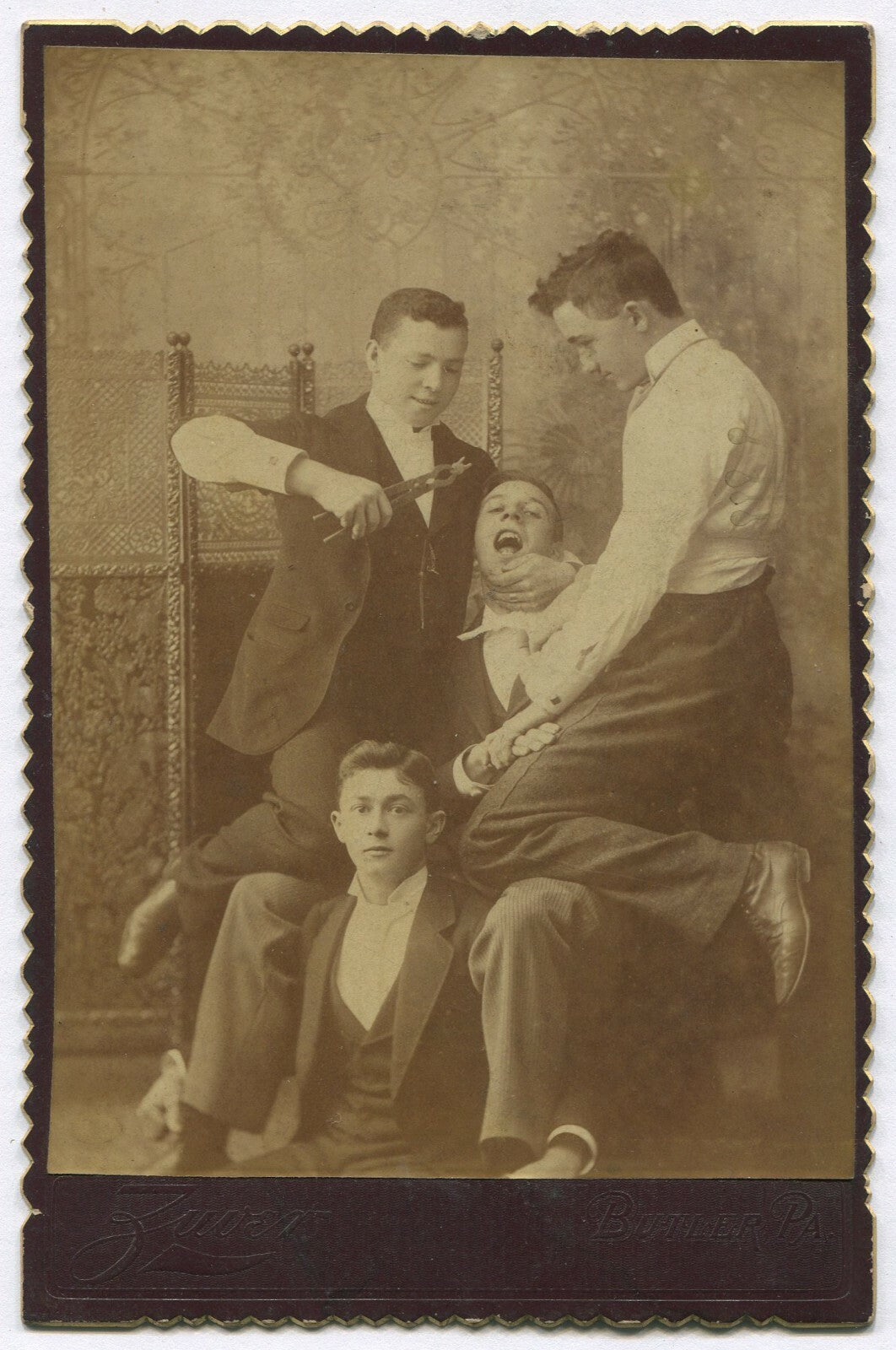 YOUNG MEN ENGAGED IN TOOTH EXTRACTION, COMICAL. CABINET CARD. BUTLER, PA. IMAGE AND CARD SHOW WEAR. This item is a guaranteed authentic photo as shown from the original time period. NOT a copy, an ORIGINAL OLD PHOTO.