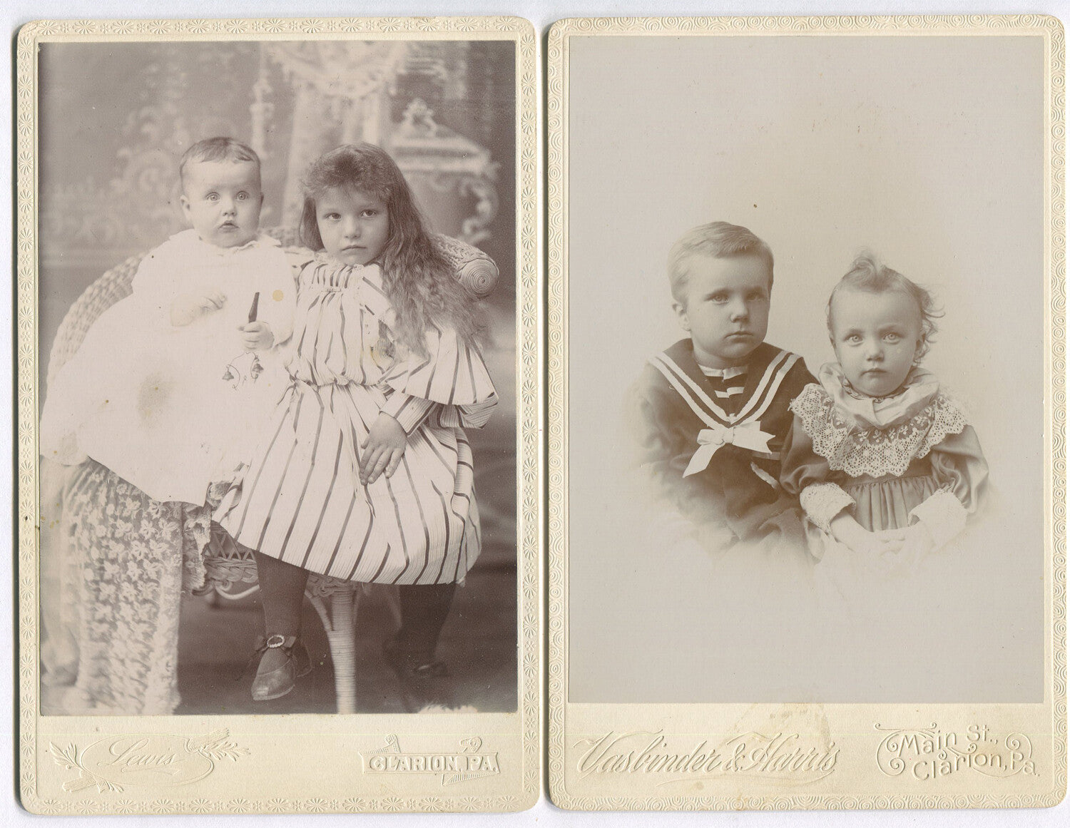 YOUNG SIBLING PORTRAITS, NOT EVERYONE IS HAPPY. CABINET CARD 2 SET.